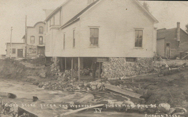 Black and white postcard of the back of Coy's Store showing the damaged part of the foundation supported by posts, after the washout of August 25, 1910, Alden, Michigan