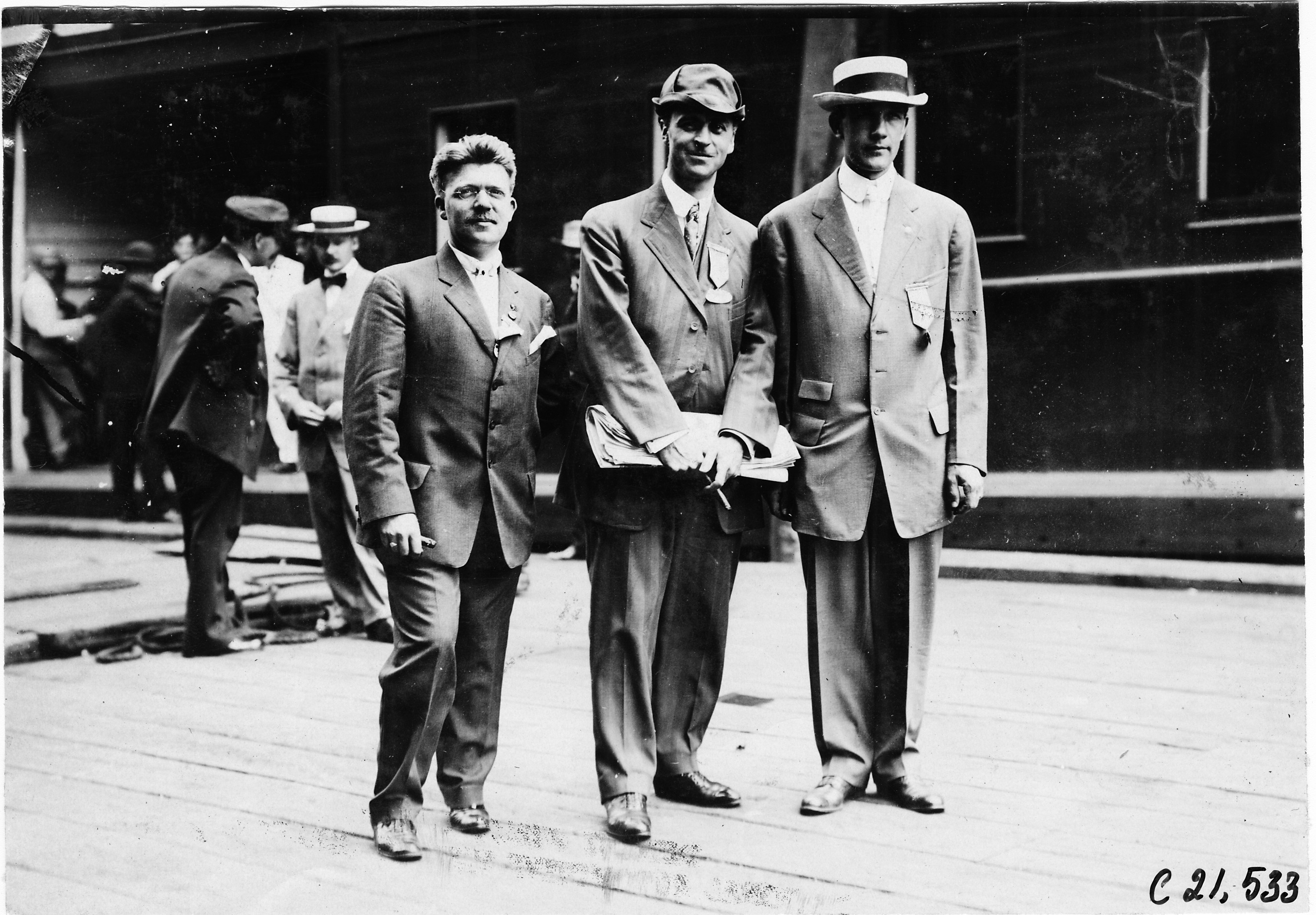 4.5x6.75 black and white photograph of three men posing, R. Davis and E. Lorie, John Gillespie, secretary of the Automobile Club, at Detroit, Michigan, 1909. Negative #C21,533. Photo edges cut unevenly.
