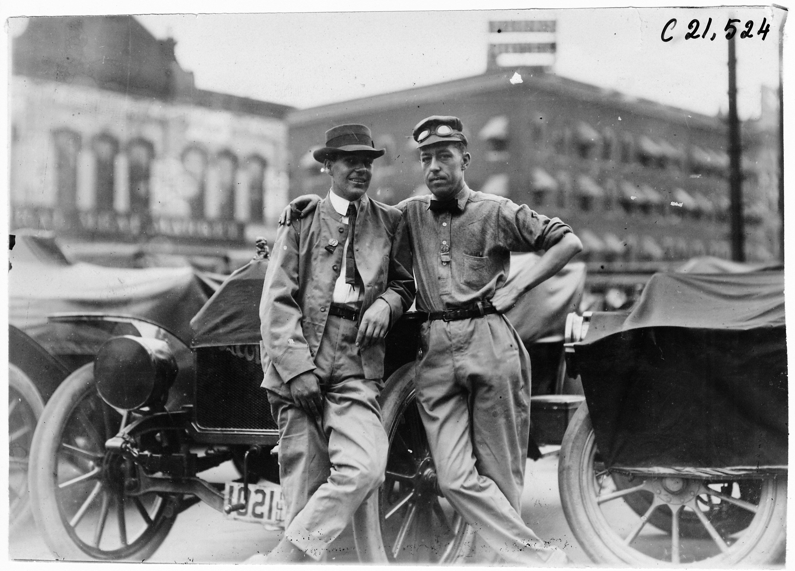 4.5x6.75 black and white photograph of two men in motoring clothes posing next to covered cars. Caption on photo back: 'Showing how the tourists were dressed at the start of the sixth annual Glidden Tour (i.e., Sixth Annual Reliability Run of the American Automobile Association),' Detroit, Michigan, July 12, 1909. Negative #C21,524. Photo edges cut unevenly.