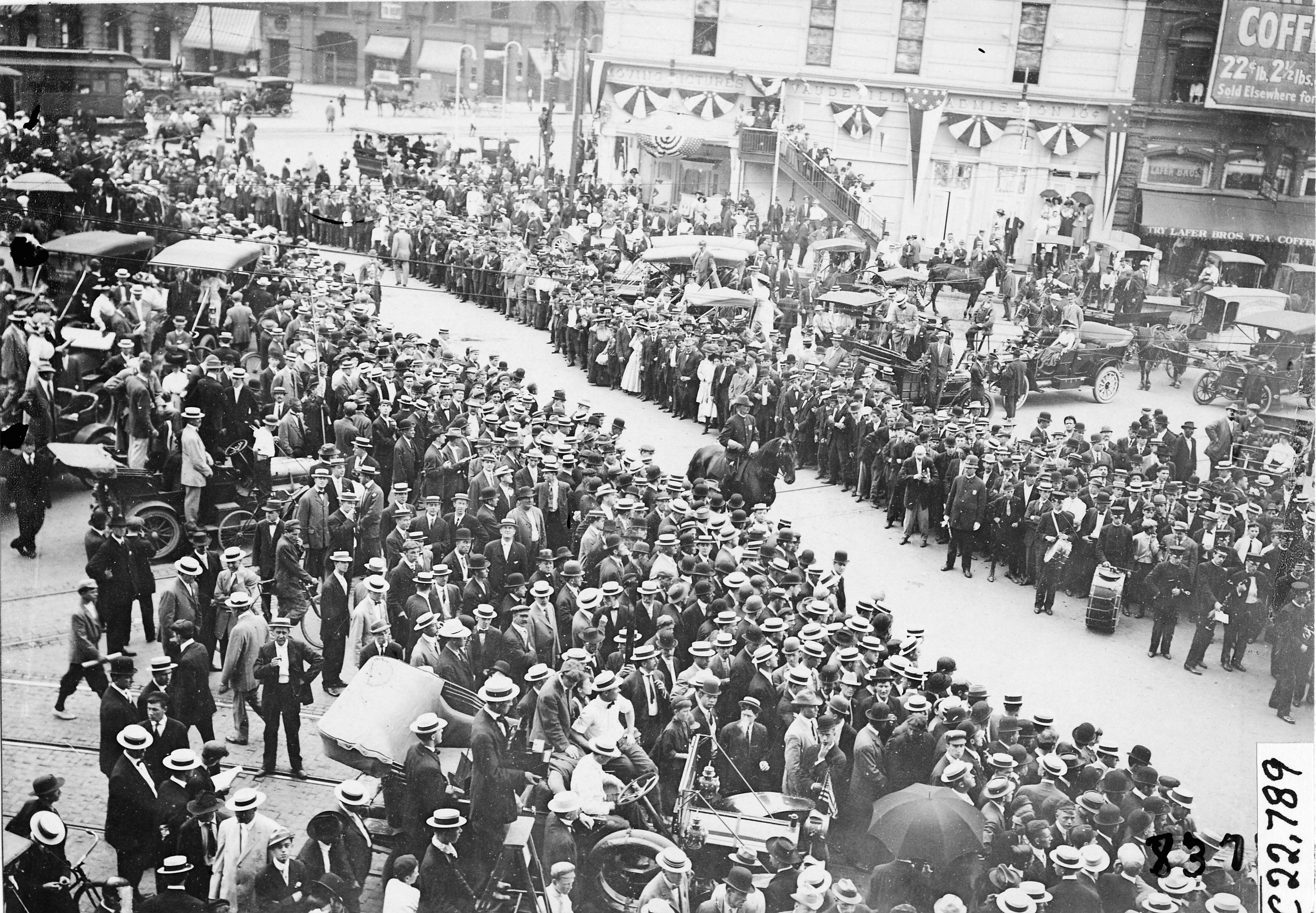 Crowd lining street for start of 1909 Glidden Tour, Detroit, Mich.