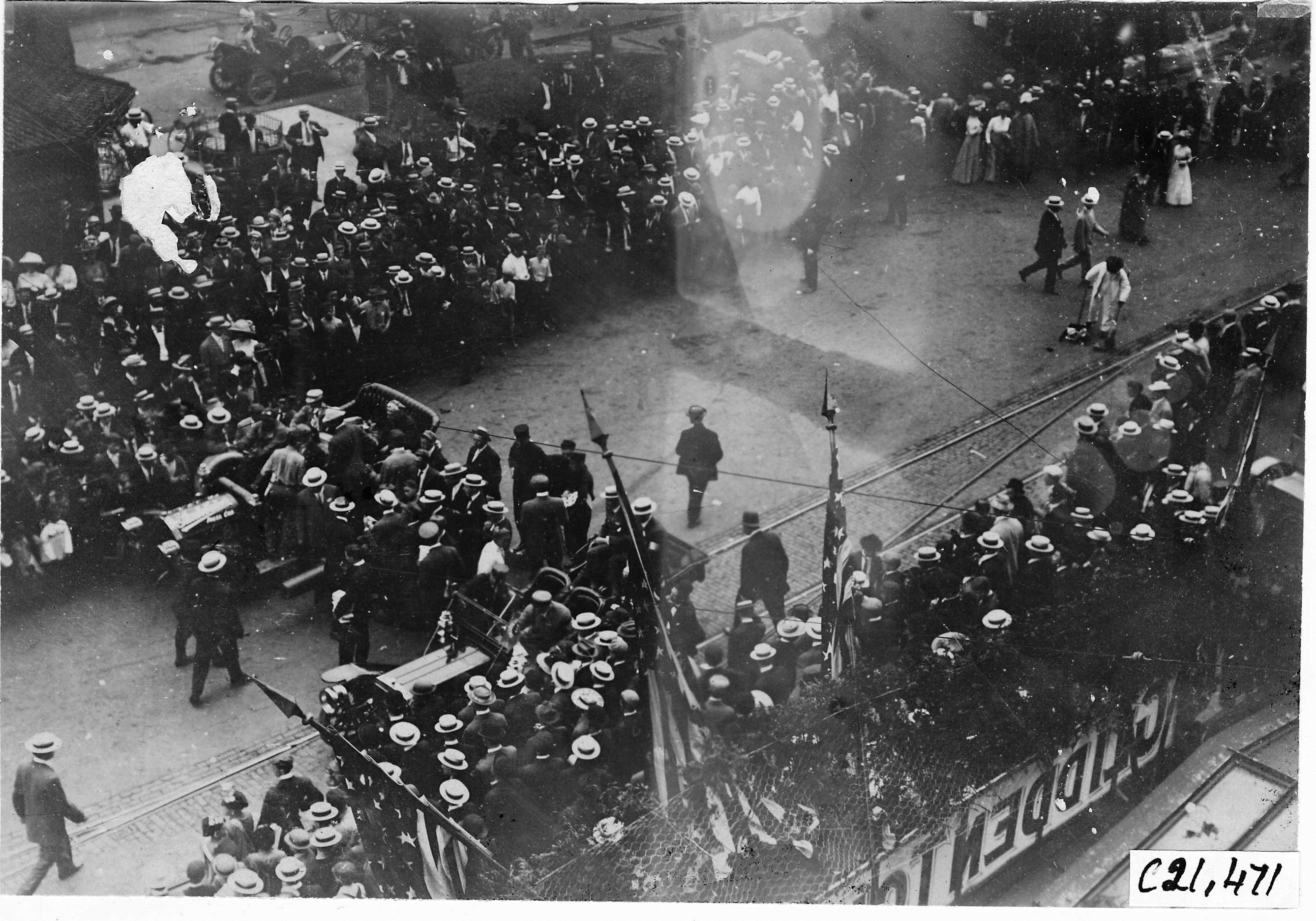 4.5x6.75 black and white photograph of two cars side-by-side in street, crowd lining street, U.S. flags protruding, at start of the Glidden Tour, Detroit, Michigan, July 12, 1909. Negative #C22,471. Emulsion gone from spot in left corner, faded area in middle of image. Photo edges cut unevenly.