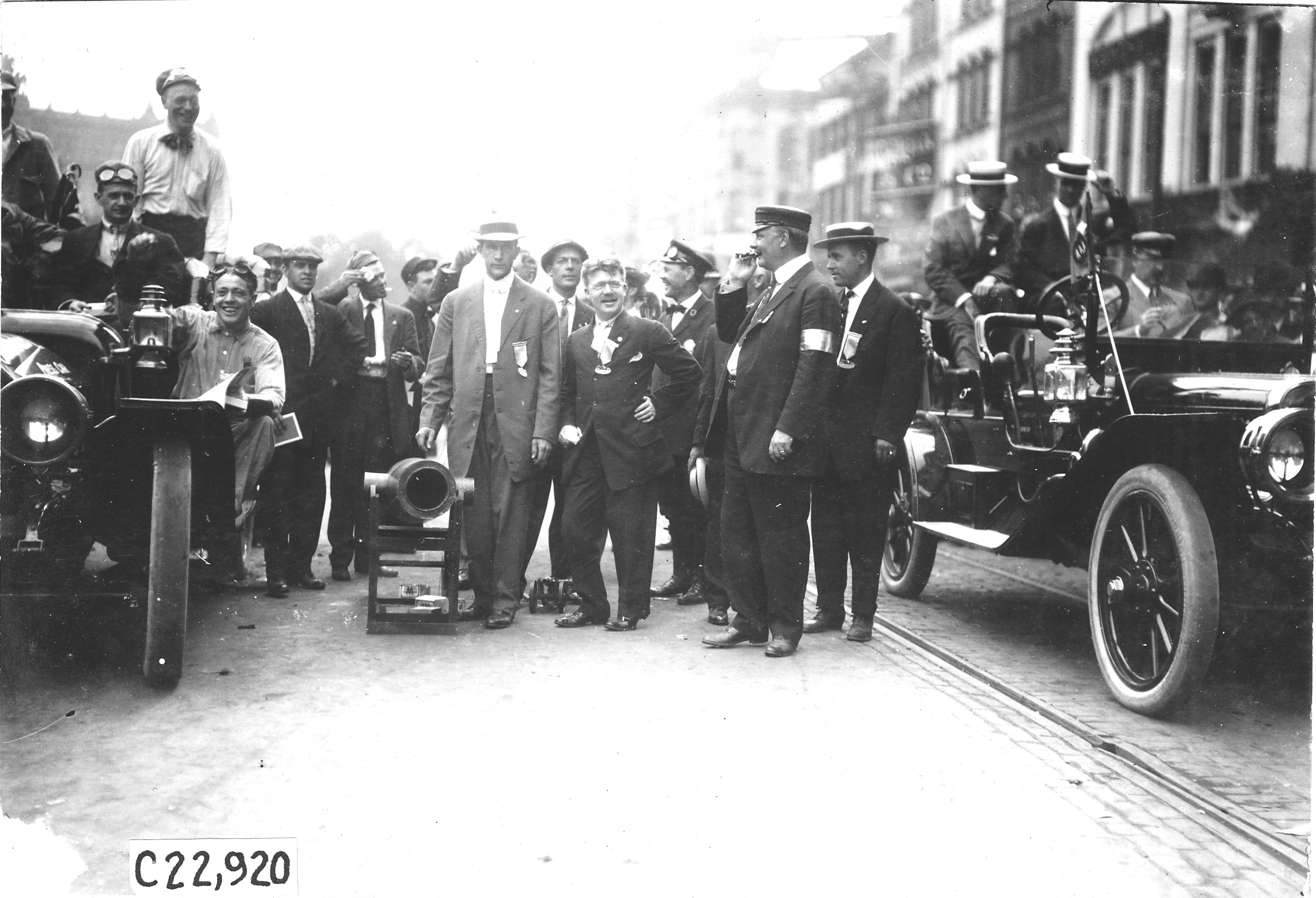 4.5x6.75 black and white photograph of officials with starter's cannon in middle of street, cars with drivers on both sides, at start of the Glidden Tour, Detroit, Michigan, July 12, 1909. Negative #C22,920.