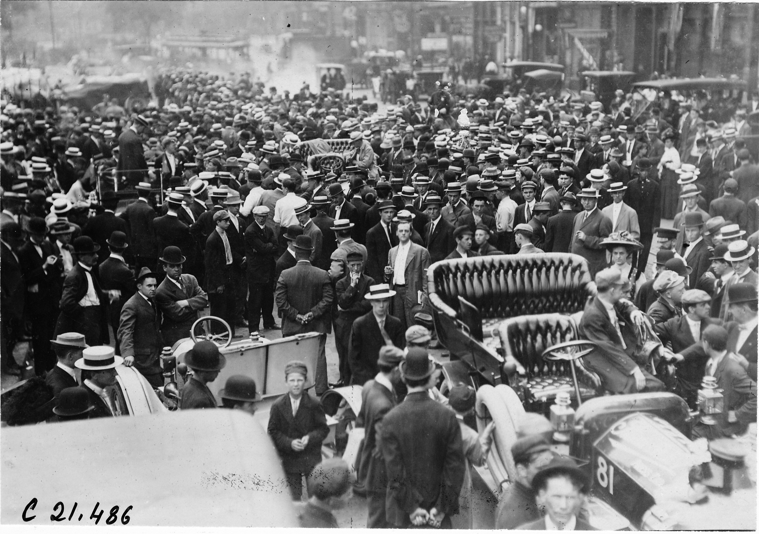 4.5x6.75 black and white photograph of dense crowd and cars, at start of the Glidden Tour, Detroit, Michigan, July 12, 1909. Negative #C21,486. Photo edges cut unevenly.