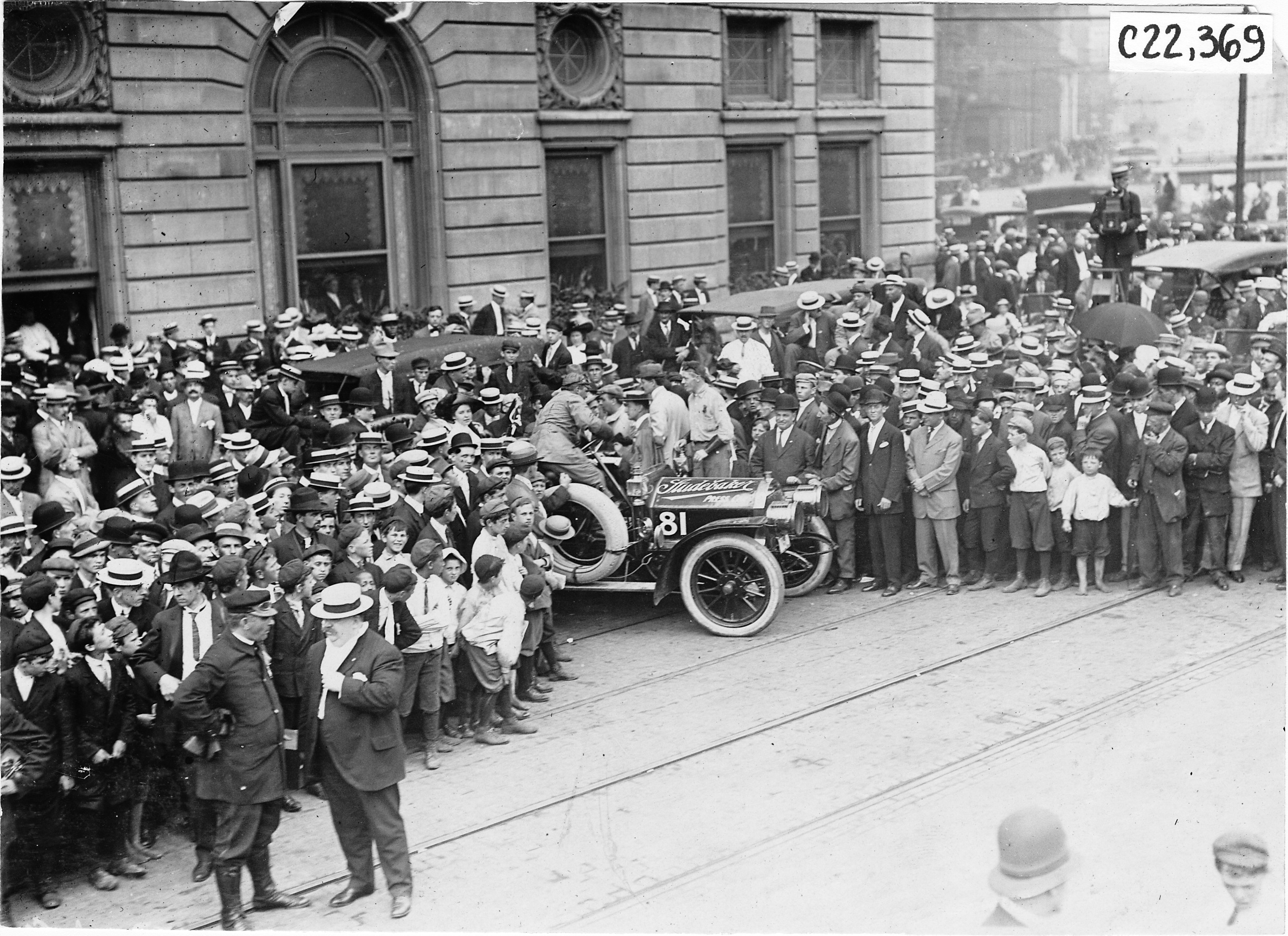 4.5x6.75 black and white photograph of Studebaker press car, #81, driver getting in, in crowd by Pontchartrain Hotel, at start of the Glidden Tour, Detroit, Michigan, July 12, 1909. Negative #C22,369.