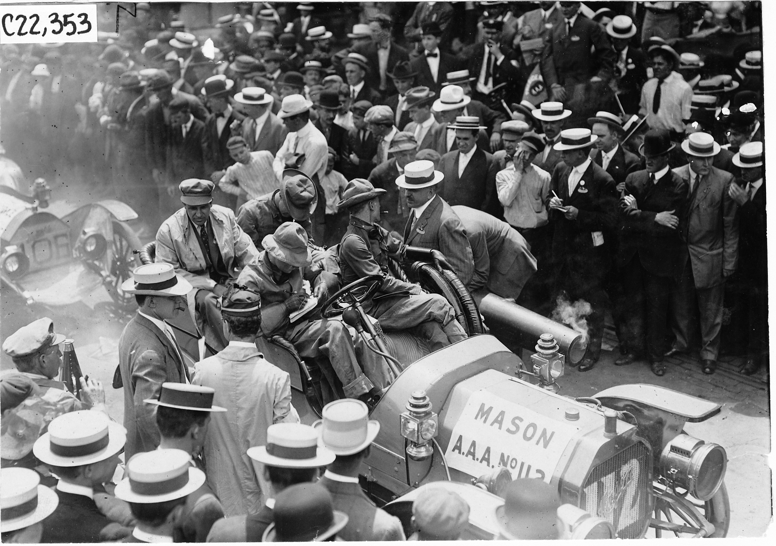 4.5x6.75 black and white photograph of Mason car in street, driver and passengers all in motoring gear, surrounded by crowd of men in suits and straw hats, at start of the Glidden Tour, Detroit, Michigan, July 12, 1909. Negative #C22,353. Small hole near top of image. Photo edges cut unevenly.