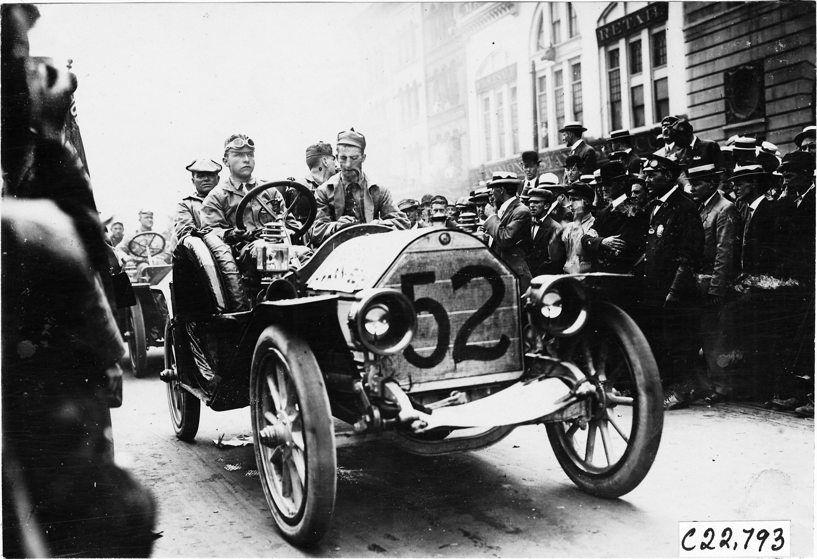 4.5x6.5 black and white photograph of car #52, surrounded by a crowd of men, at start of Glidden Tour, Detroit, Michigan, 1909. Negative #C22,793.