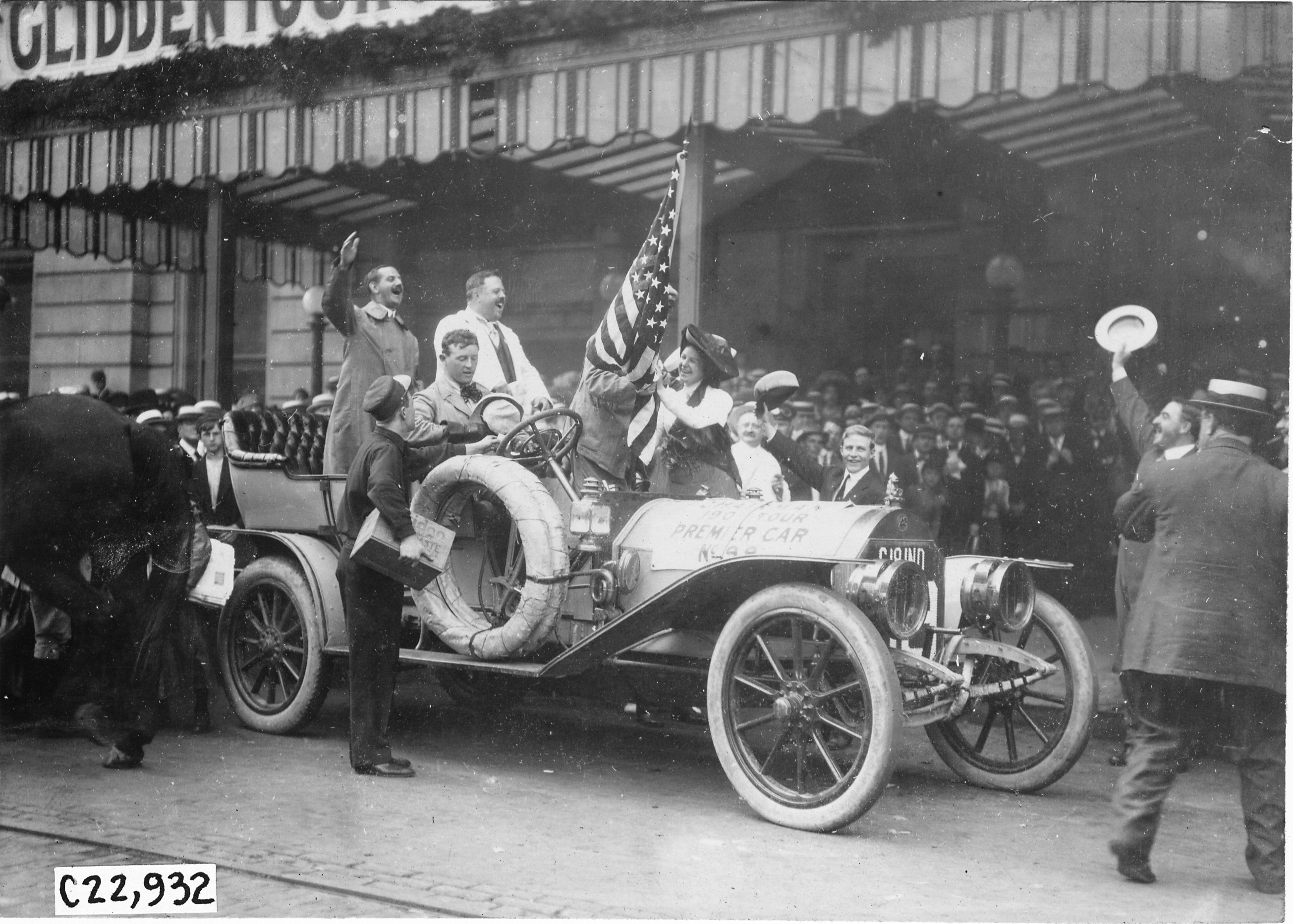 4.75x6.5 black and white photograph of chairman's car, Premier #99, driver Ray McNamara, with male passenger holding American flag, in front of the Pontchartrain Hotel, surrounded by crowd, at start of Glidden Tour, Detroit, Michigan, 1909. Negative #C22,932.