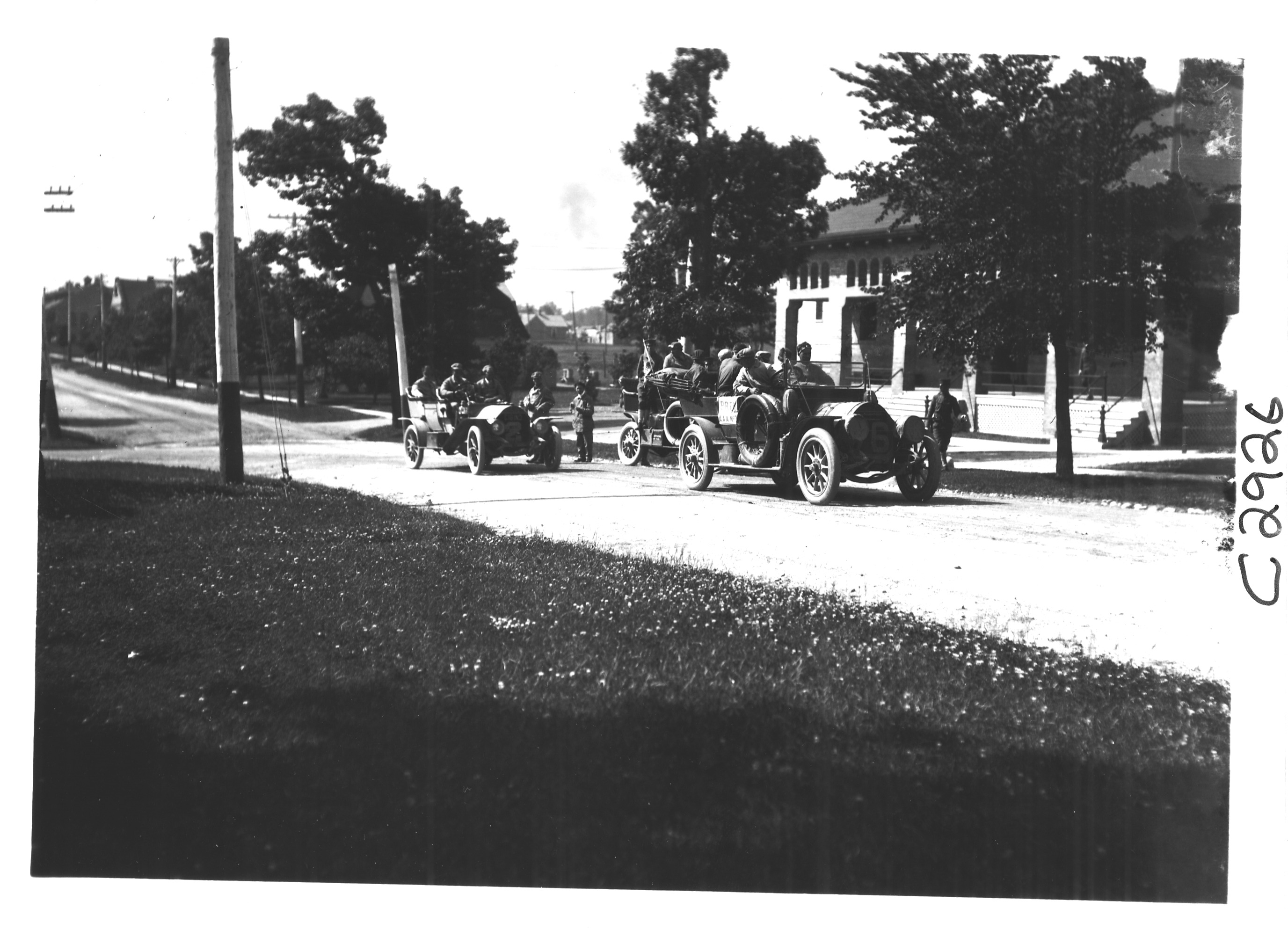 5x7 black and white photograph of entrants, Thomas press car #76, driver George Schuster with passengers and entrant Premier car #2, driver J.D. Hammond and passengers, passing a residence, at the Glidden Tour, Detroit, Michigan, 1909. Negative #C2926.
