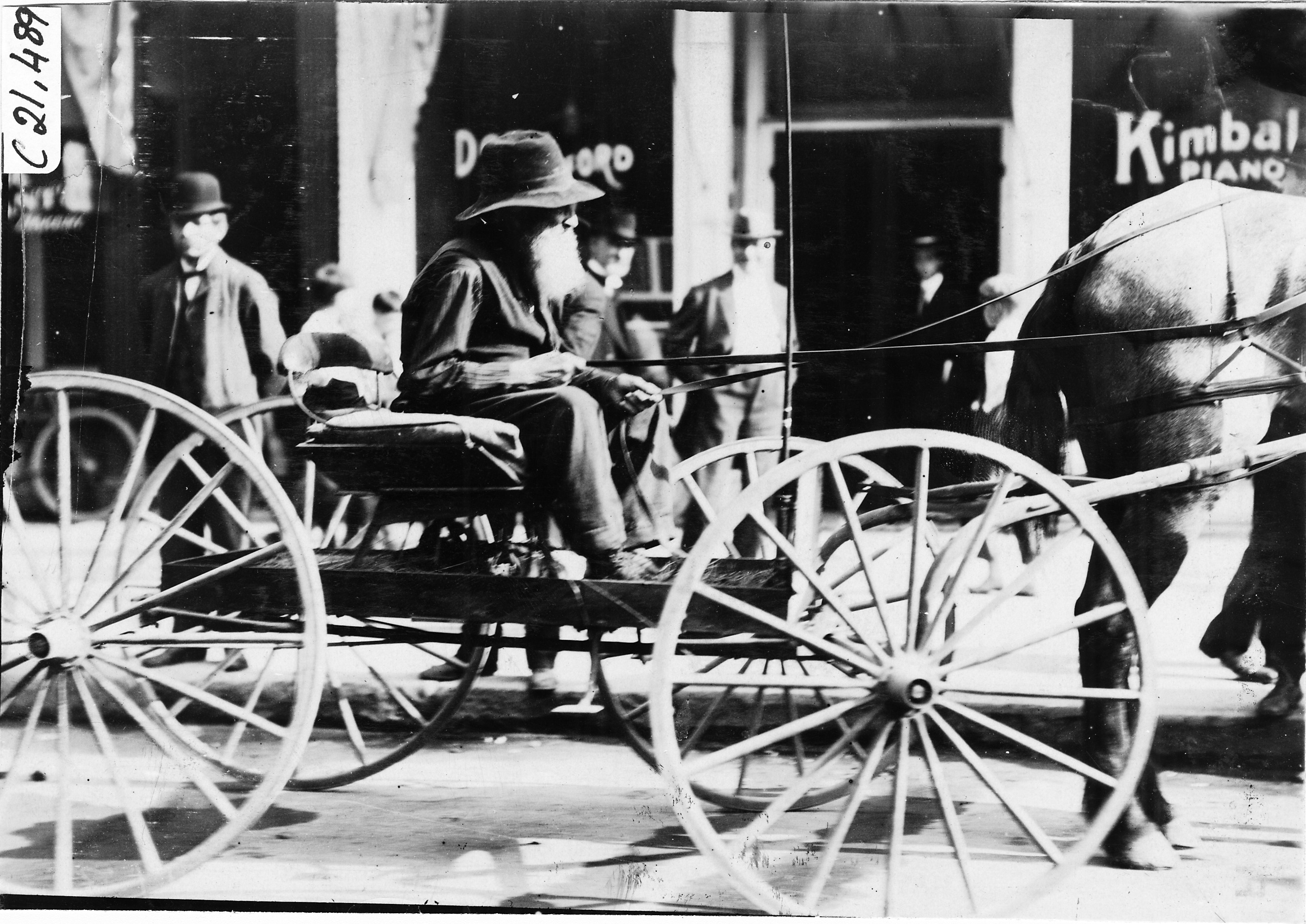 4.75x6.75 black and white photograph of man sitting in a horse-drawn vehicle. Caption on photo back: 'One of the men that came into the city to see the Glidden tourists.' 1909 Glidden Tour. Negative #C21,489. Photo edges cut unevenly.