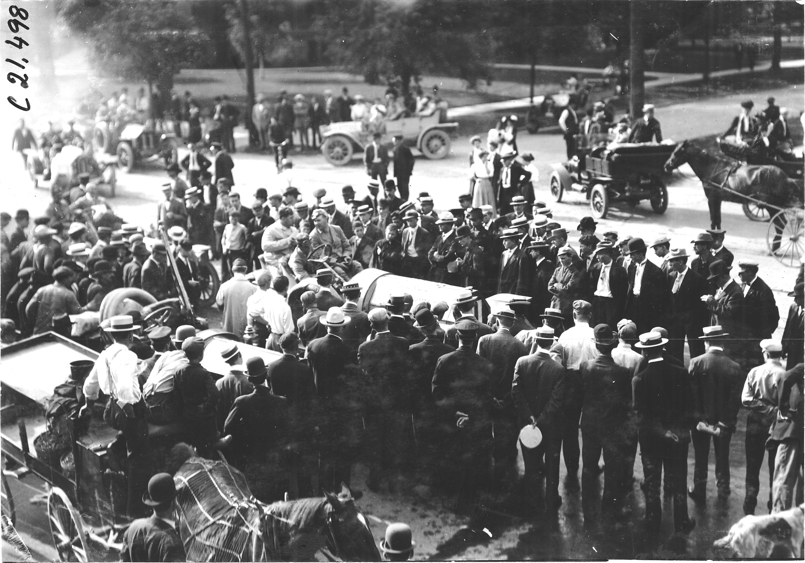 Crowd surrounding Maxwell car checking in at Kalamazoo, Mich., 1909 Glidden Tour