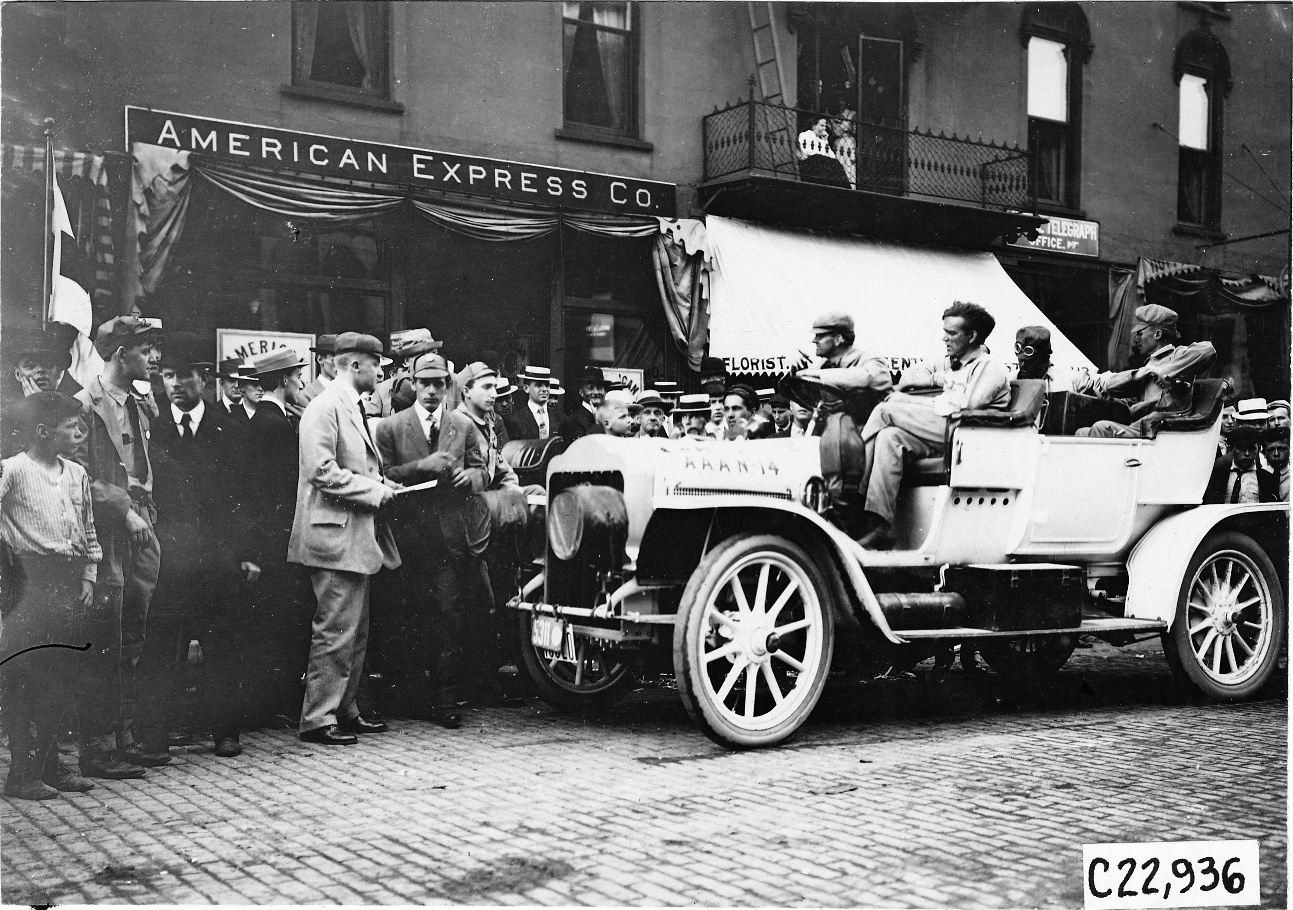 4.5x6.5 black and white photograph of White Steamer car #14, with driver J.N. Searles and three passengers, in front of American Express Co., crowd of male onlookers next to car, in Kalamazoo, Michigan, 1909 Glidden Tour. Negative #C21,936.