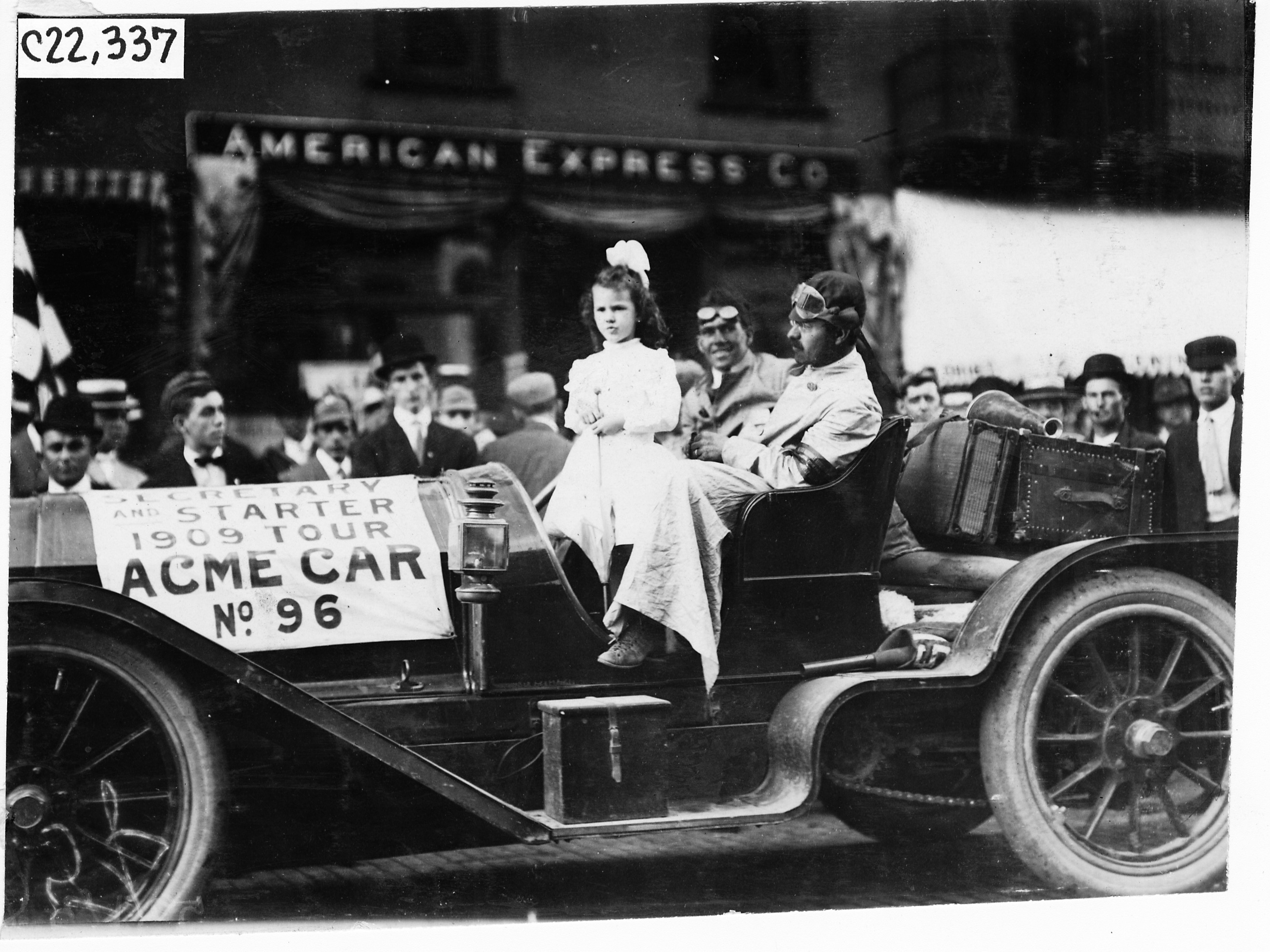 4.75x6.5 black and white photograph of starter and secretary's Acme car, starter E.L. Ferguson in passenger's seat and young girl holding closed parasol standing in front of him, in front of American Express Co., crowd of male onlookers next to car, in Kalamazoo, Michigan, 1909 Glidden Tour. Negative #C22,337. Photo edges cut unevenly.