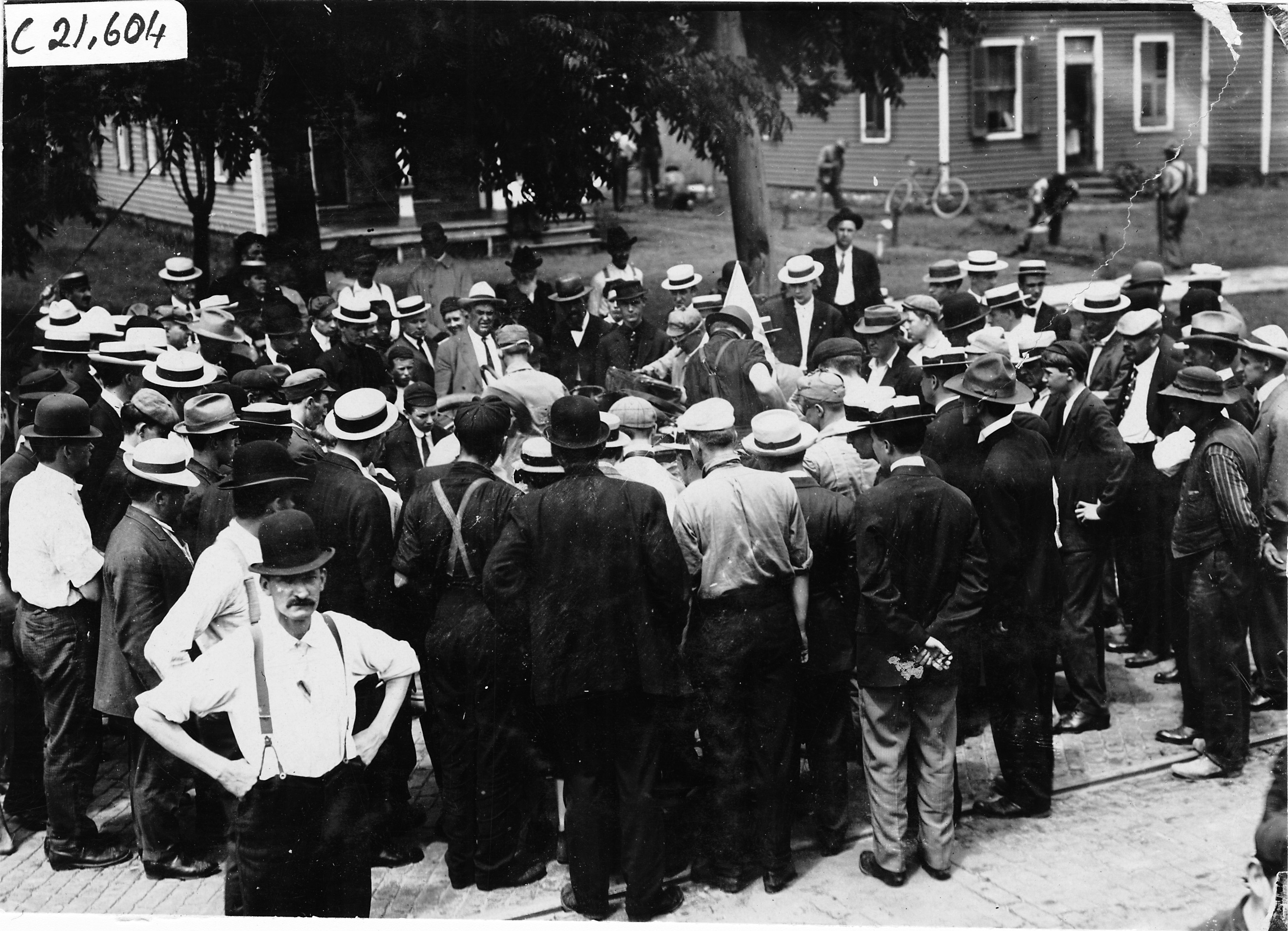 4.75x6.5 black and white photograph of Hupmobile and Brush runabout cars on residential street, surrounded by a crowd of men, in South Bend, Indiana, at 1909 Glidden Tour. Negative #C21,604.