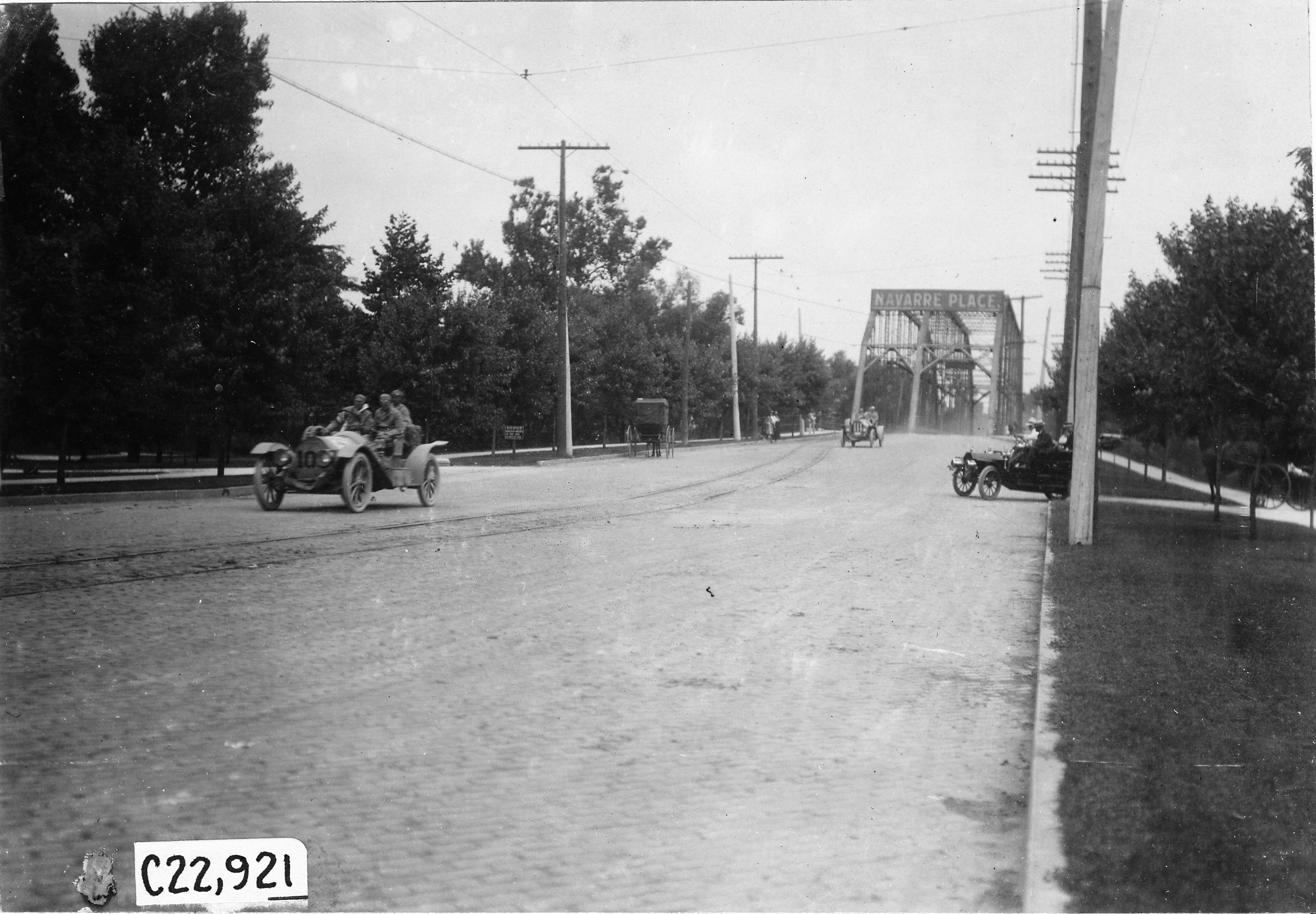 4.5x6.5 black and white photograph of cars leaving South Bend, Indiana, Navarre Place bridge in background, at 1909 Glidden Tour. Caption on photo back: 'On road to Chicago.' Negative #C22,921.
