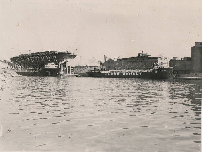 JOHN W. BOARDMAN being loaded at Huron Portland Cement Company. Steamer ALPENA taking on load of stone from the Wyandotte Chemicals Company