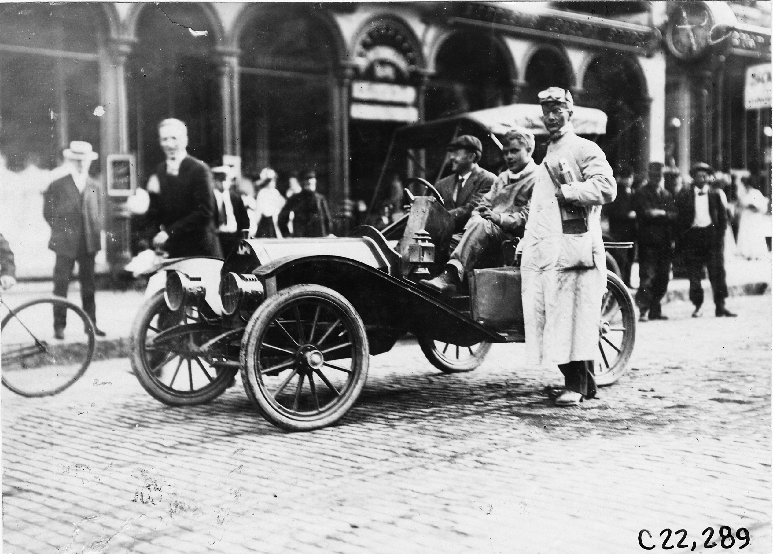 4.5x6.5 black and white photograph of driver and passenger with a man standing next to the car dressed in a white coat and goggles on his head, at 1909 Glidden Tour. Negative #C22,289.