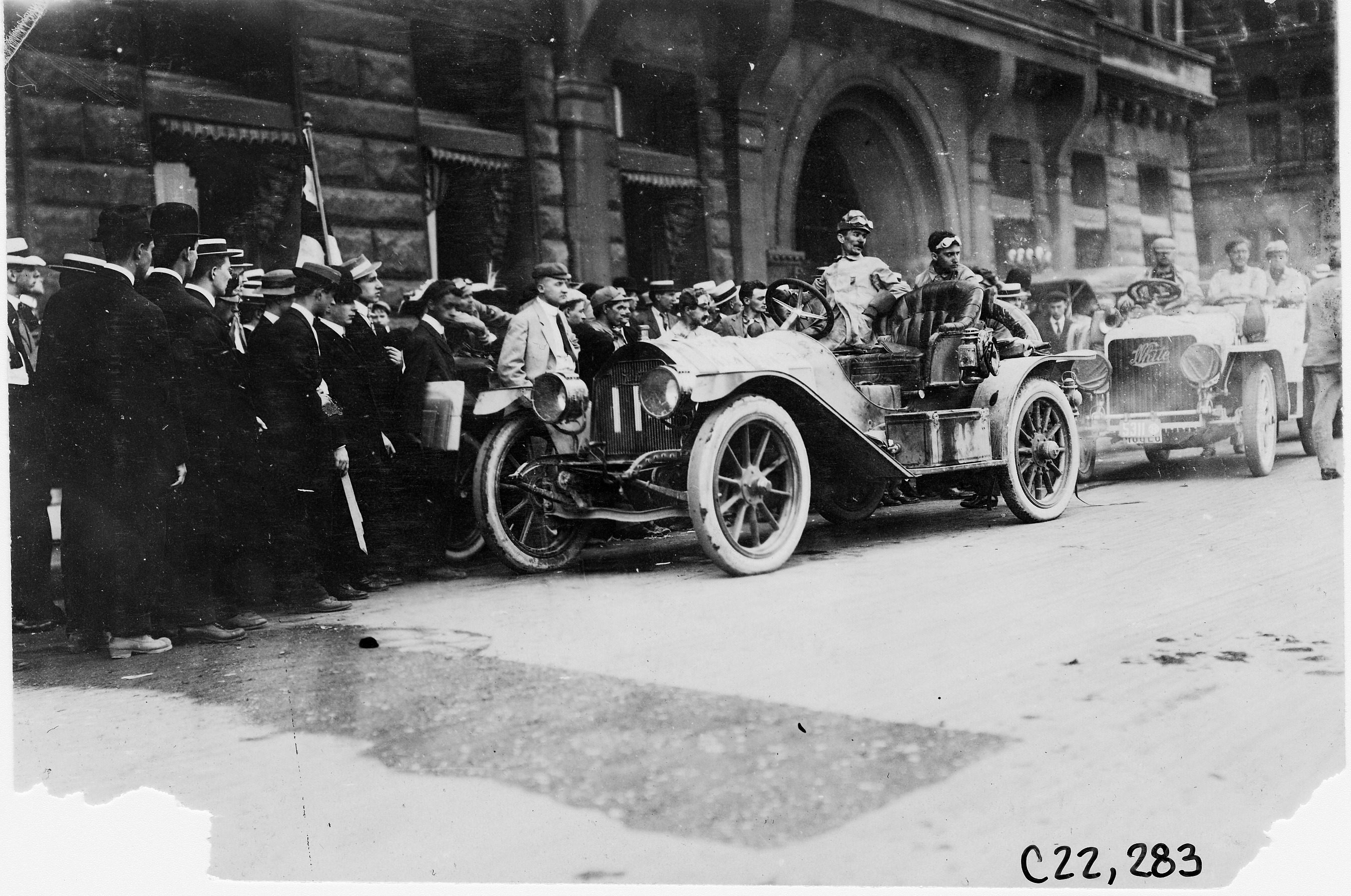 John L. Moore in #114 arriving at Chicago, Ill., 1909 Glidden Tour