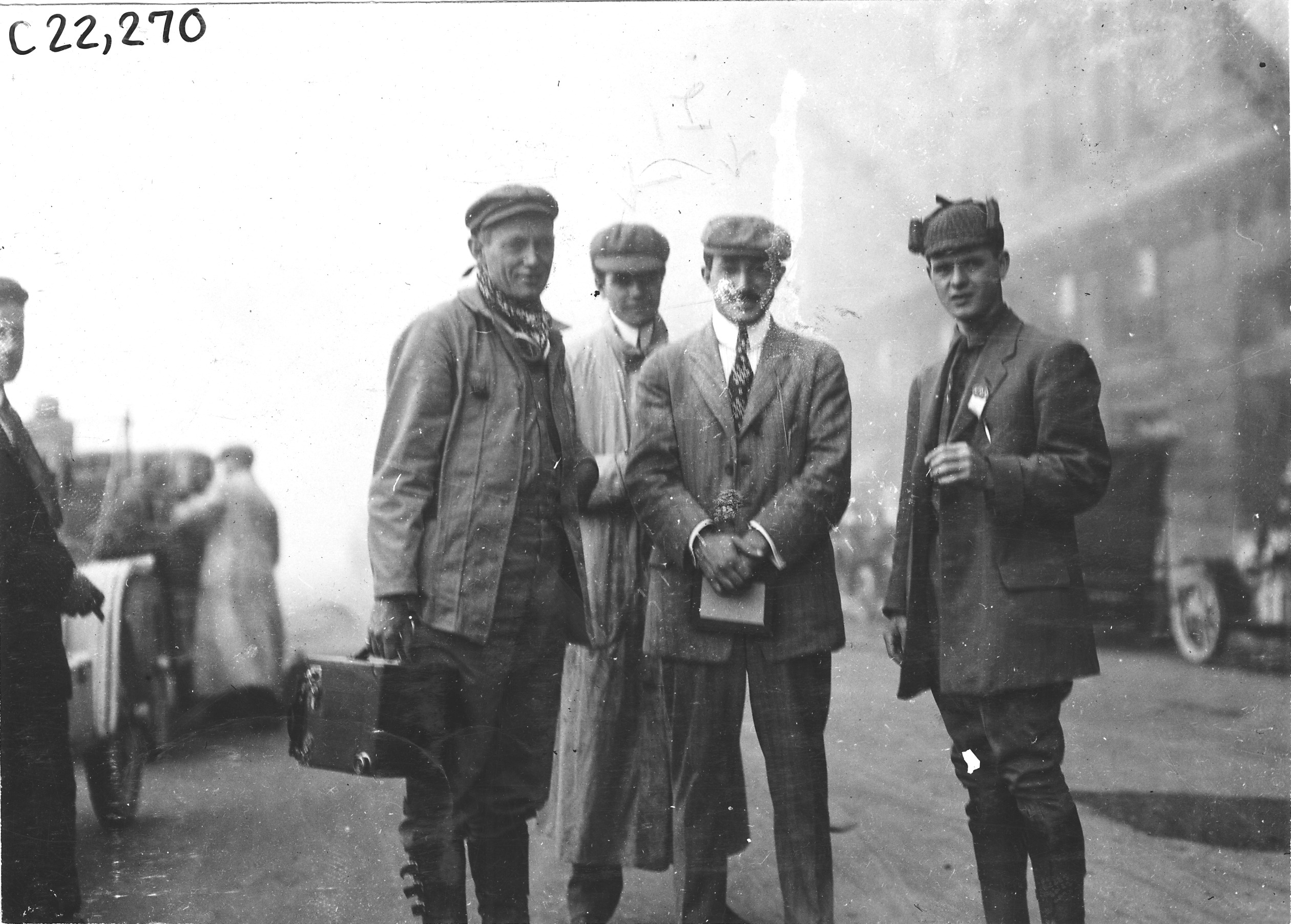 4.5x6.5 black and white photograph of four men posing for camera in Chicago, Illinois, three of the men are identified as F. Ed. Spooner (photographer), Chaurivo and Lazarnick (photographer), fourth man unknown, at the 1909 Glidden Tour. Negative #C22,270.