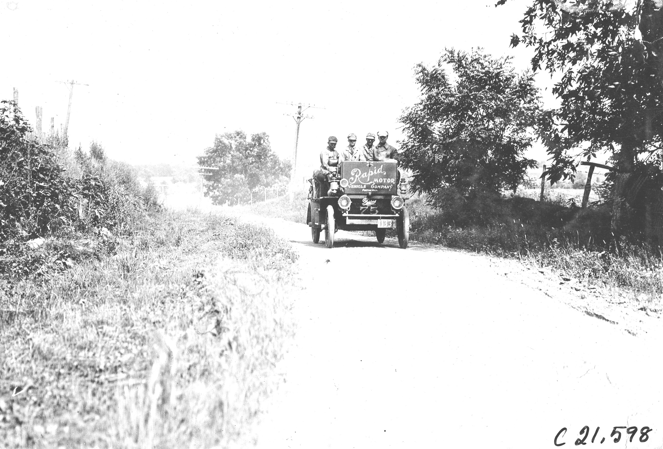 4.5x6.5 black and white photograph of the Rapid Motor Vehicle Company car, with driver and three passengers on a dirt road, at the 1909 Glidden Tour. Negative #C21,598.