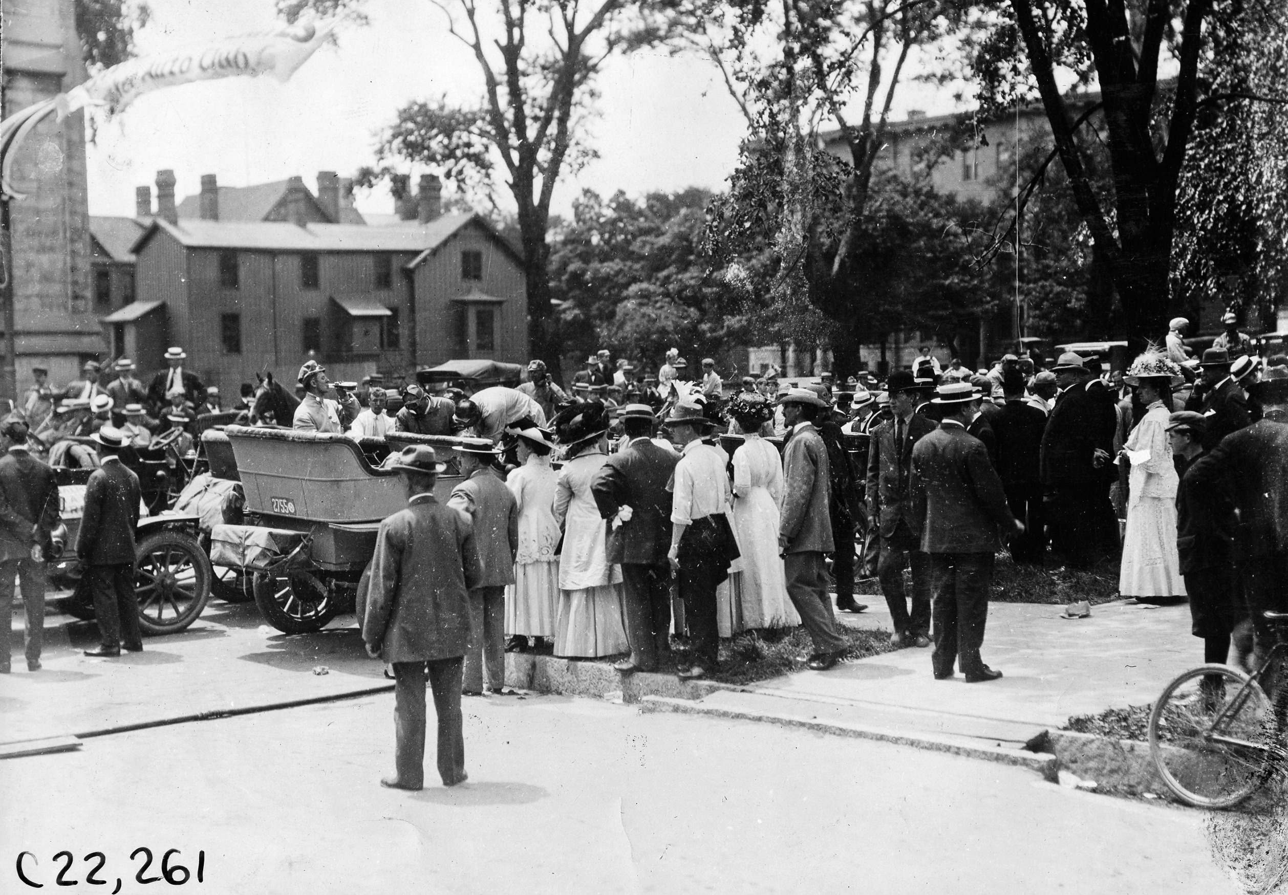 4.5x6.5 black and white photograph of the reception of the Glidden tourists at Milwaukee, a crowd of men, women in white dresses, stand around on a sidewalk and watch, at the 1909 Glidden Tour. Negative #C22,261. Photo edges cut unevenly.