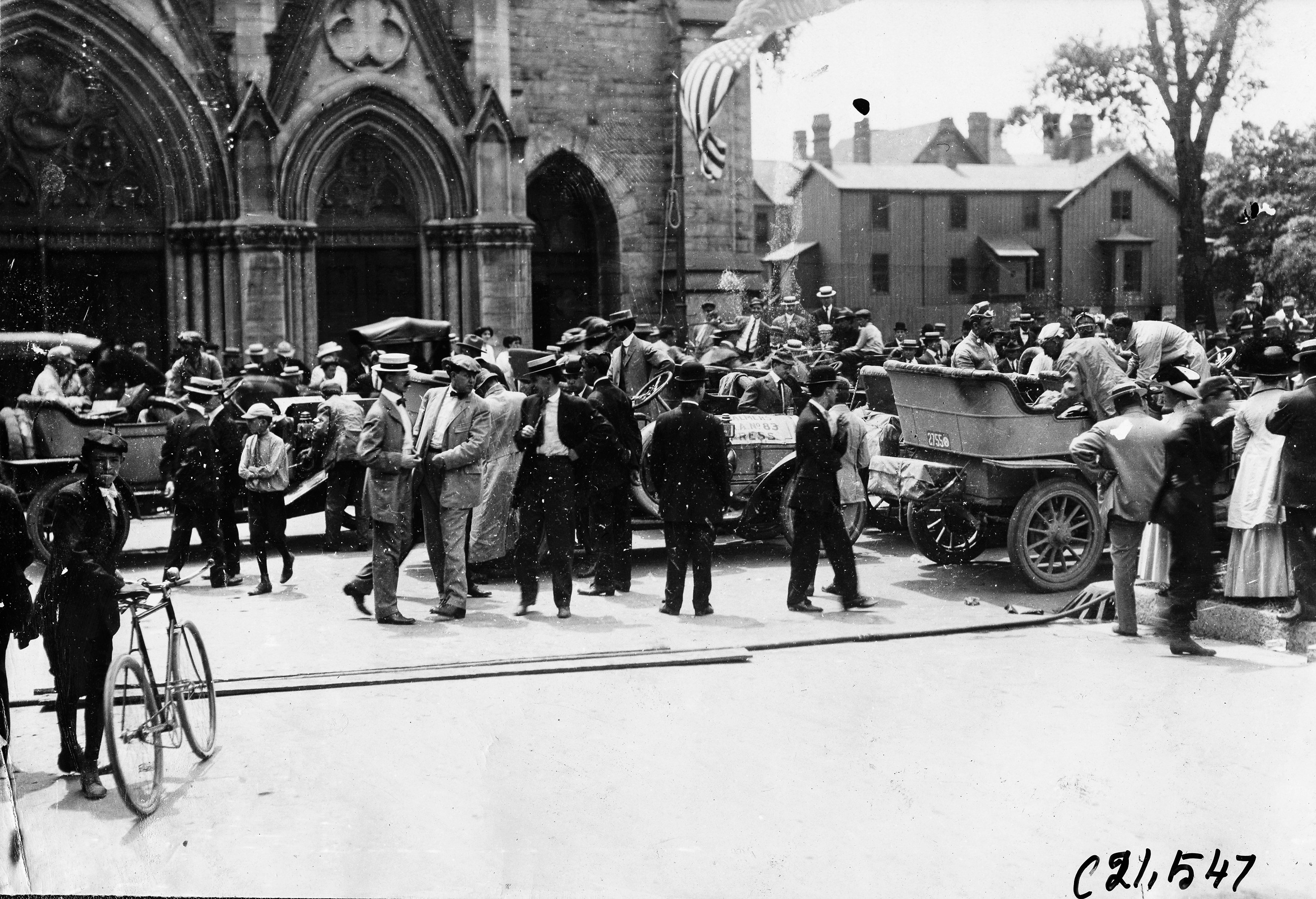 4.5x6.5 black and white photograph of people and cars in front of church, one car is Chalmers press car, at reception in Milwaukee, Wisconsin, boy with bicycle in foreground, 1909 Glidden Tour. Negative #C21,547.
