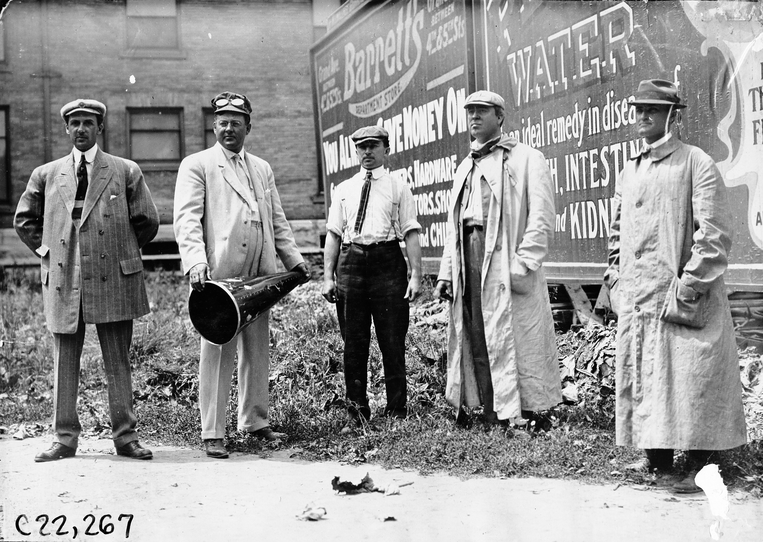 4.75x6.5 black and white photograph of President Duke and four unidentified officers of the Milwaukee Auto Club, one man holding megaphone, two men in driving dusters, all standing in front of two billboards, 1909 Glidden Tour. Negative #C22,267.