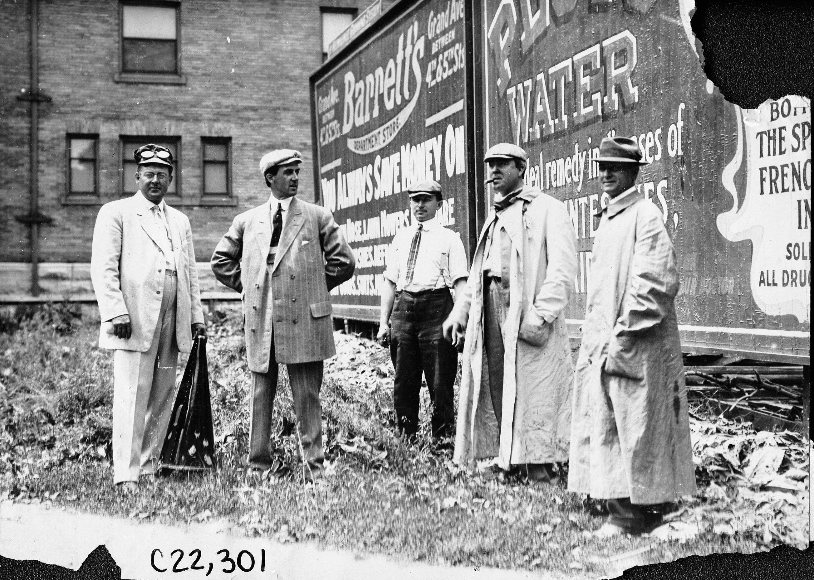 4.75x6.5 black and white photograph of President Duke and four unidentified officers of the Milwaukee Auto Club, one man with megaphone, two men in driving dusters, all standing in front of two billboards, 1909 Glidden Tour. Negative #C22,301. Upper right corner missing, tears in lower left and right corners.