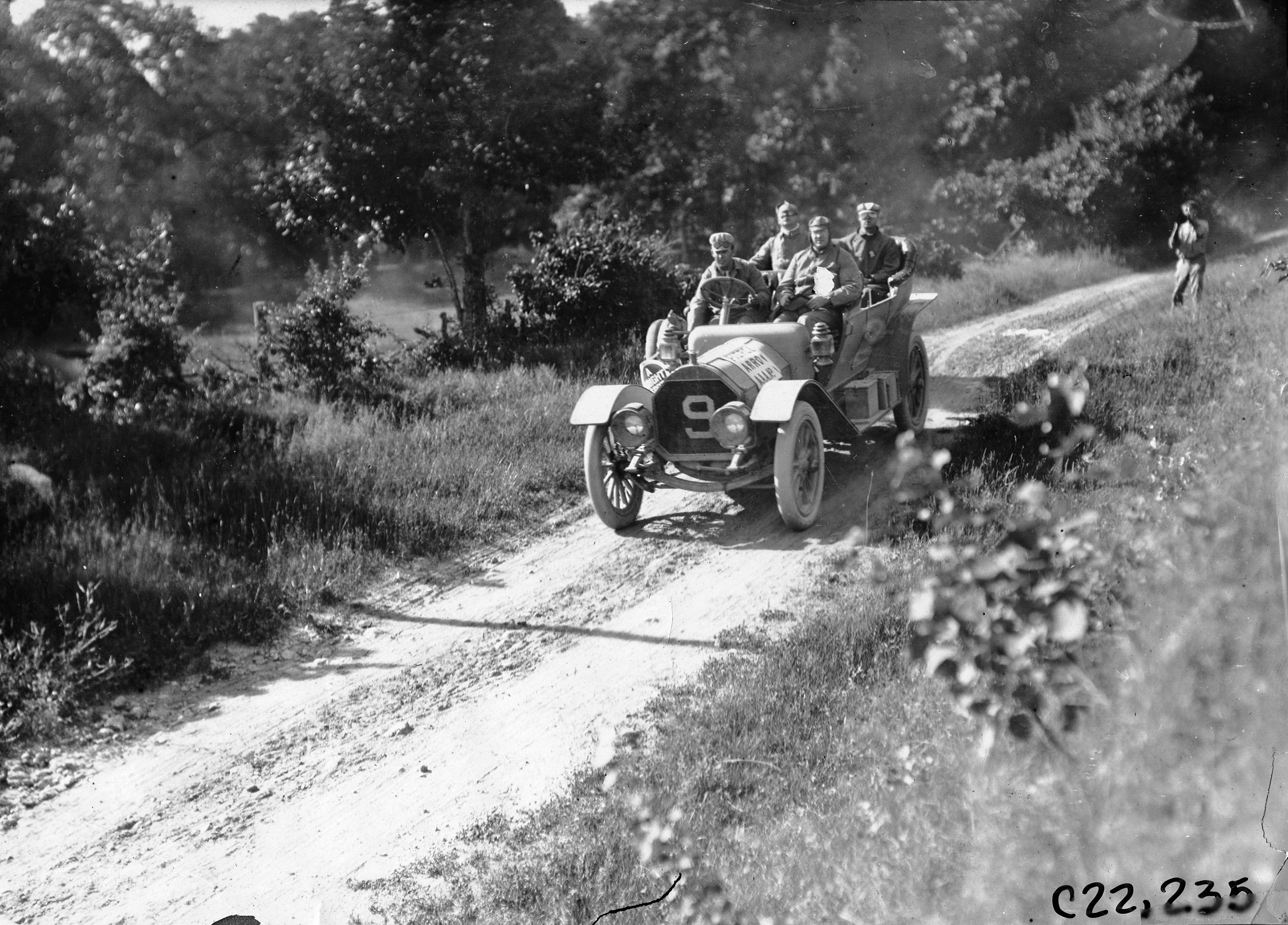 4.5x6.5 black and white photograph of the Pierce-Arrow car driven by W.F. Winchester with three passengers, a man off the road behind the car who appears to be taking a picture, at 1909 Glidden Tour. Negative C#22,235. Small piece of picture missing near the bottom left corner.