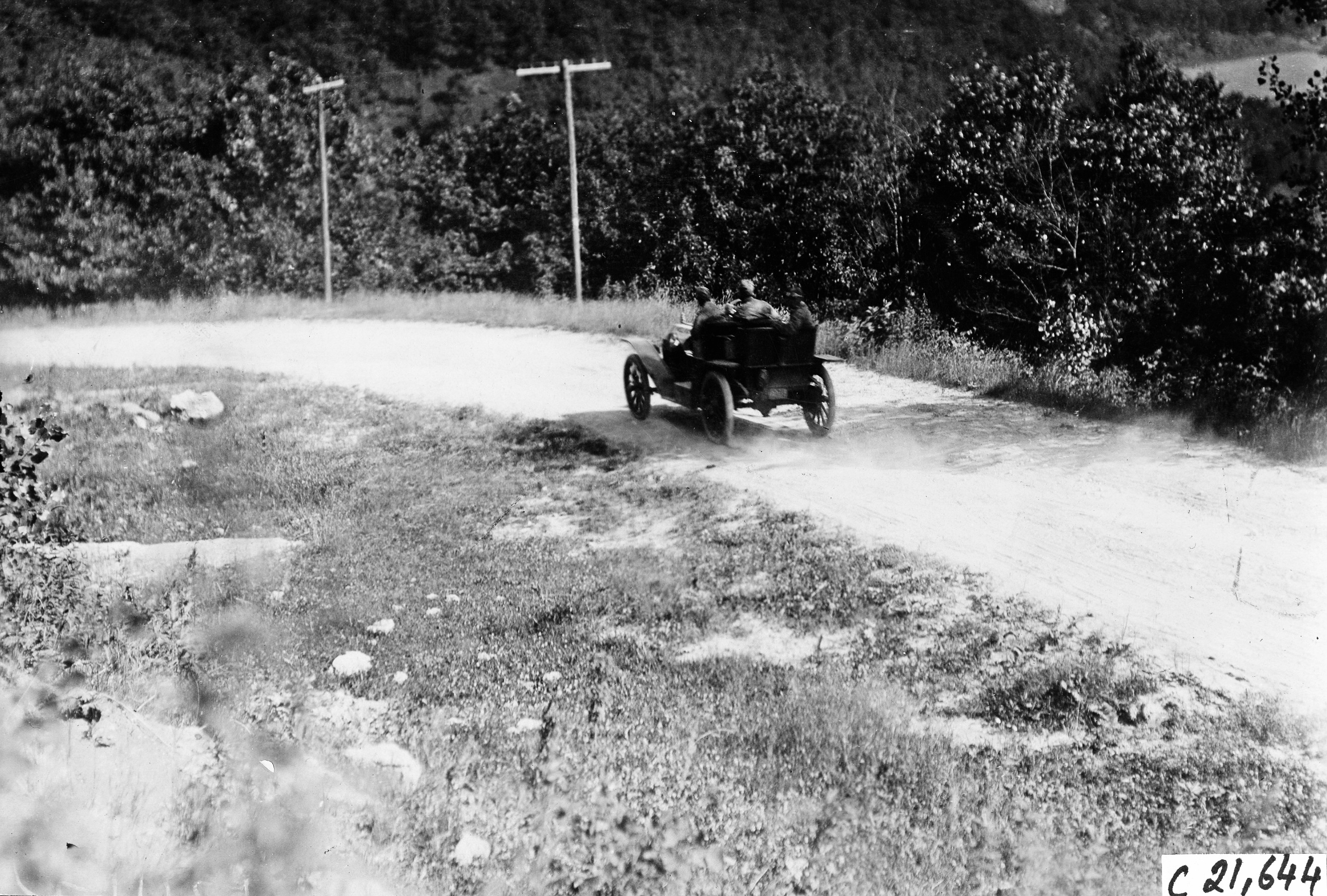 4.5x6.5 black and white photograph of rearview of a vehicle with a driver and two passengers on a dirt road, at 1909 Glidden Tour. Negative #C21,644.