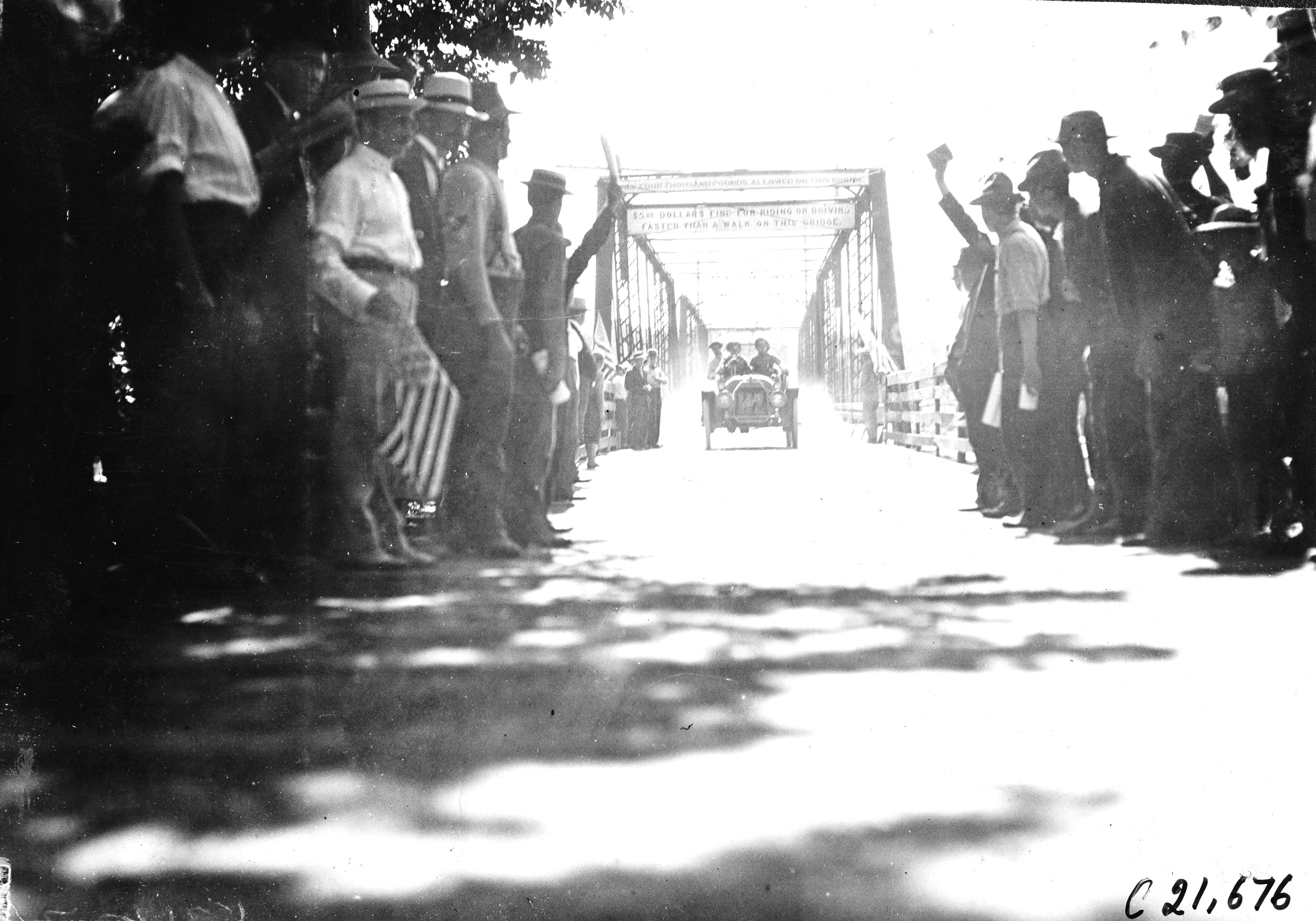 Crowd welcomes Glidden tourists as they cross the Sauk City, Wis. bridge at the 1909 Glidden Tour