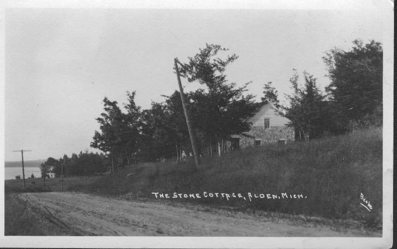 Black and white postcard of 'The Stone Cottage', Alden, Michigan, ca. 1920