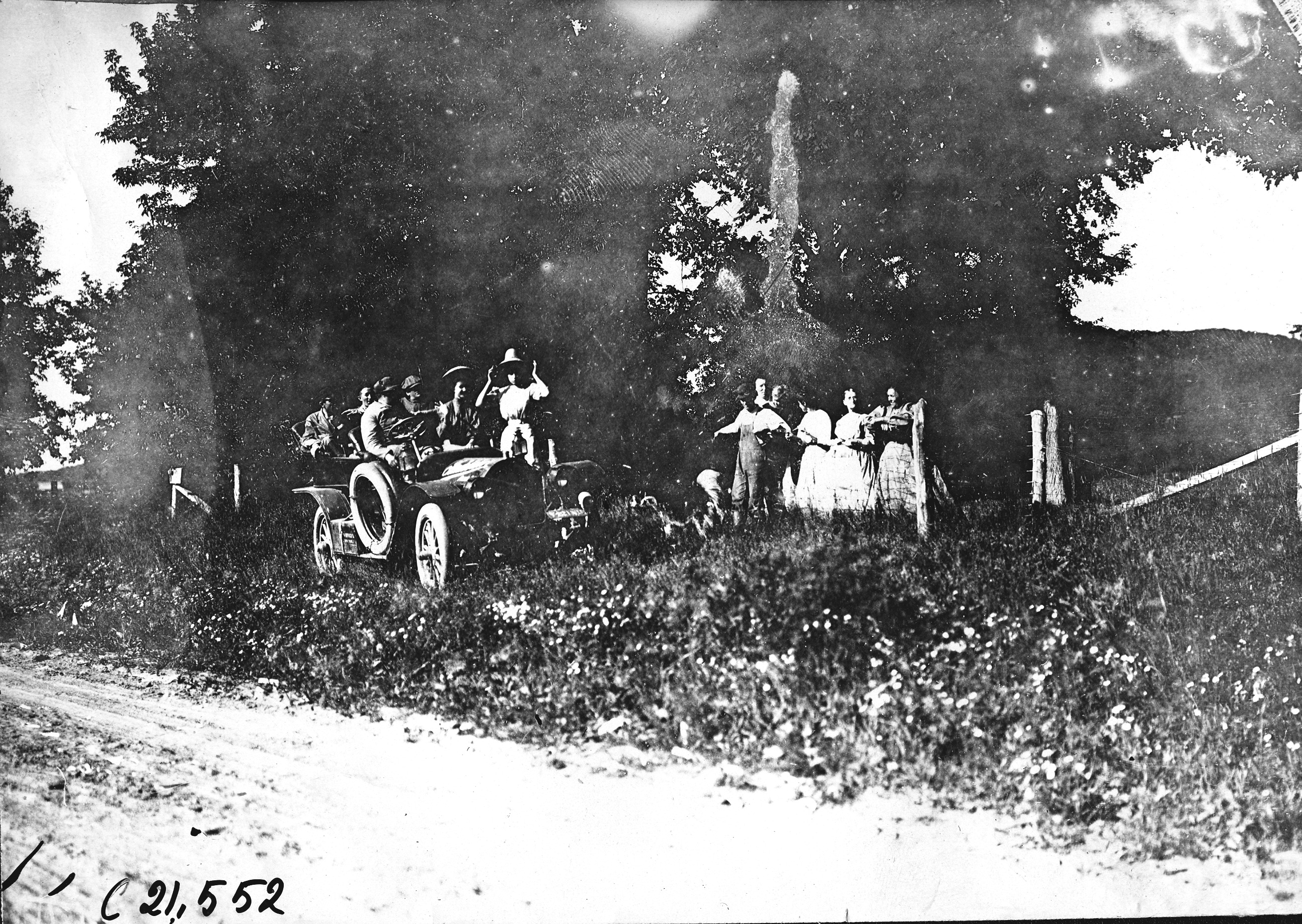 4.75x6.5 black and white photograph of women looking at Studebaker car near Baraboo, Wisconsin, at the 1909 Glidden Tour. Negative #C21,552. Photo is faded. Photo edges cut unevenly.
