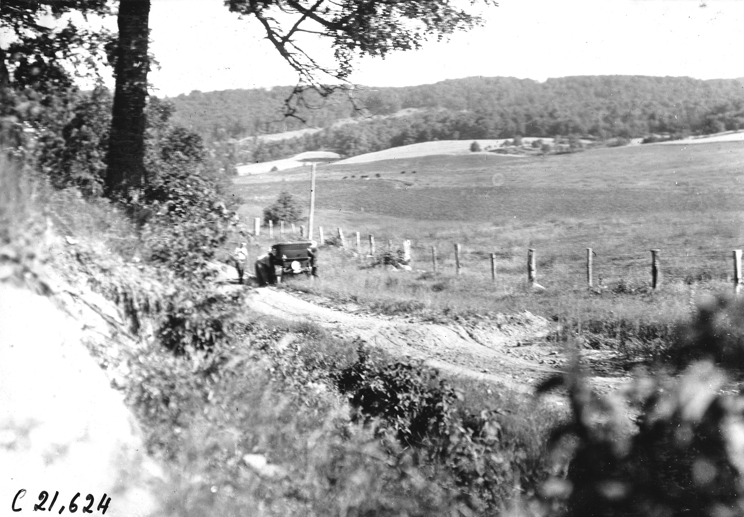 Studebaker press car off the road after breaking a wheel at 1909 Glidden Tour