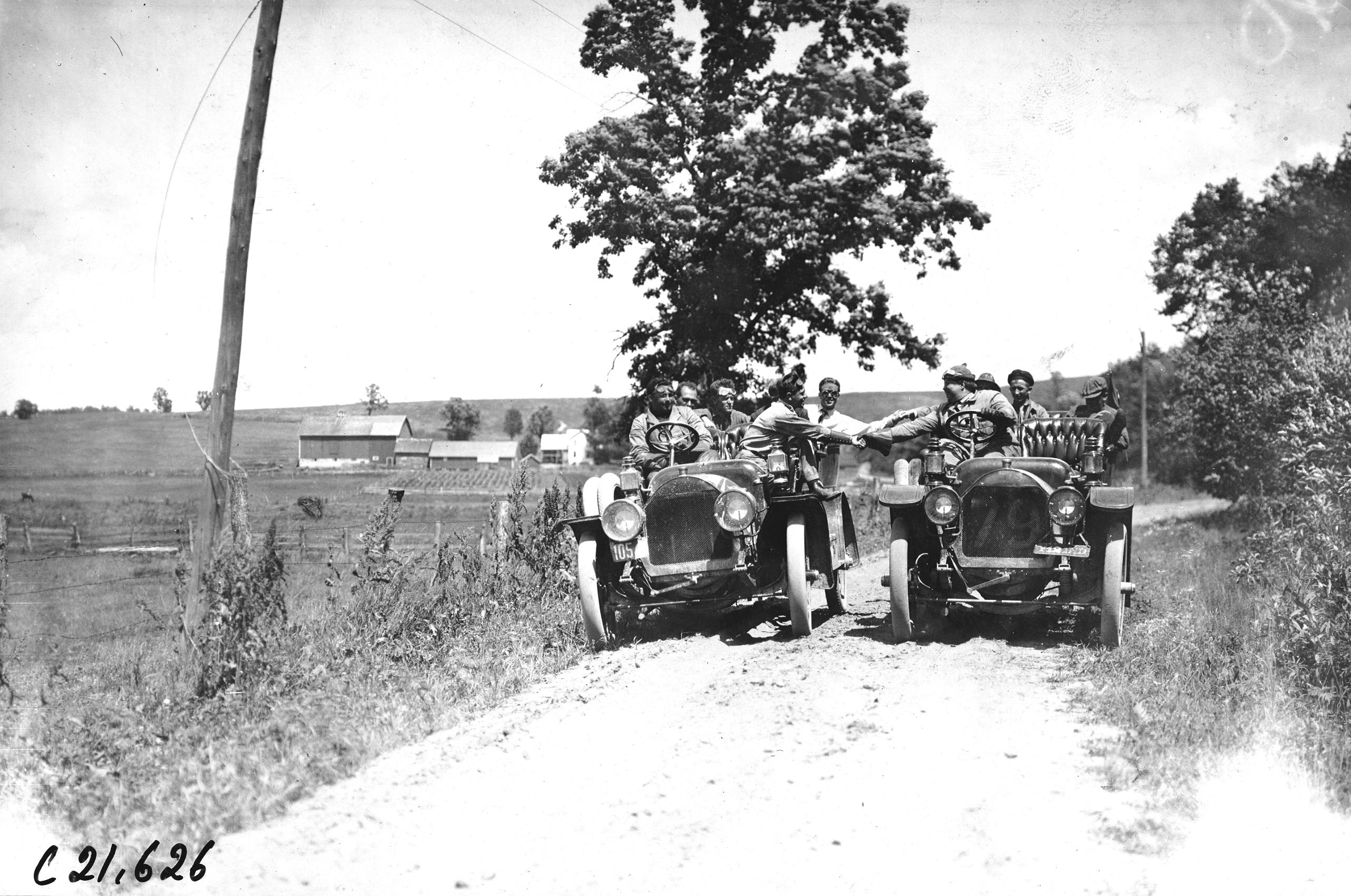 4.5x6.5 black and white photograph of Studebaker cars #79 and #81 parked side by side on rural road, men reach across cars to shake hands, at the 1909 Glidden Tour. Negative #C21,626. Photo edges cut unevenly.