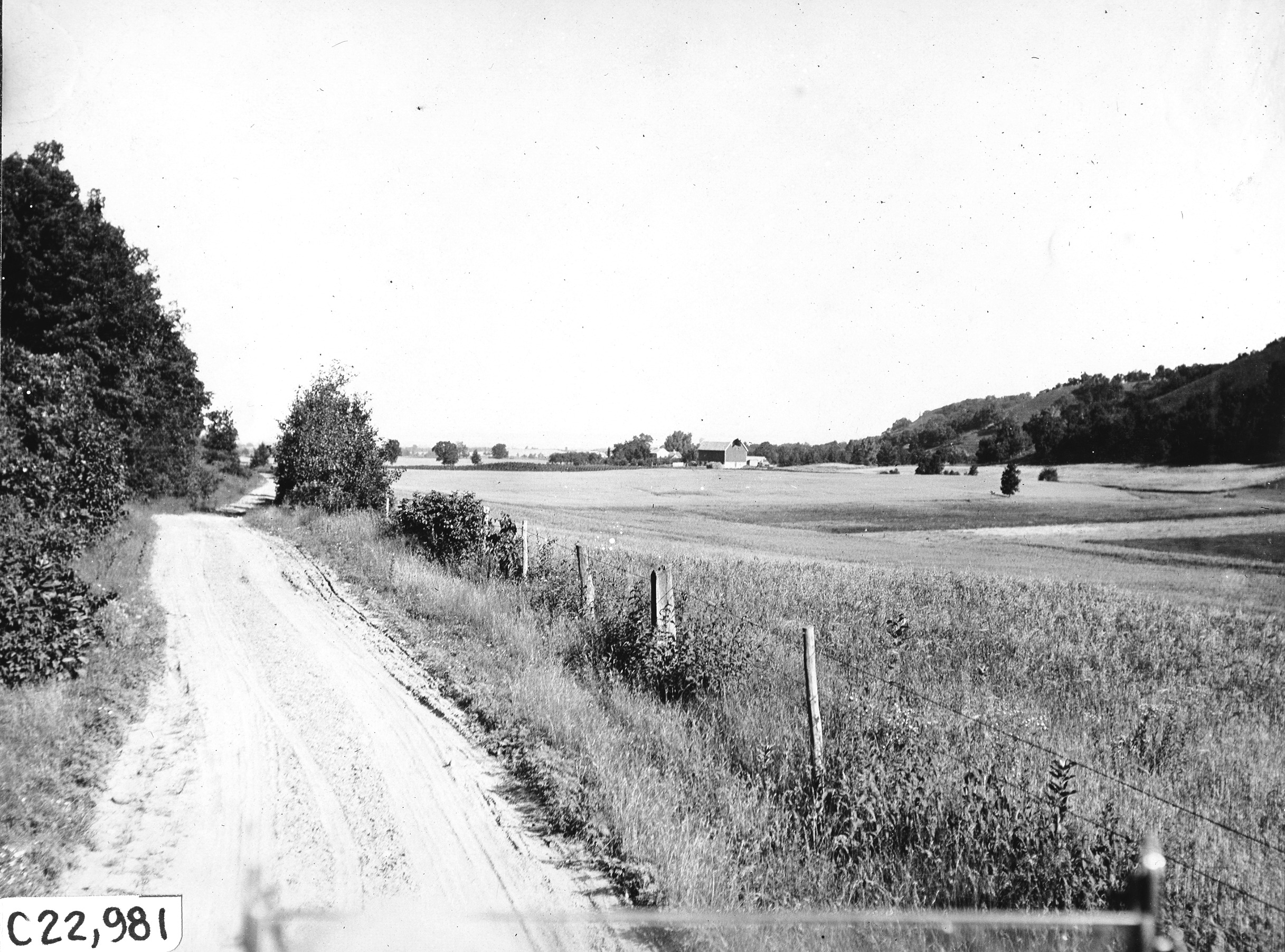 4.5x6 black and white photograph of rural road and countryside view taken from the back of a car, at the 1909 Glidden Tour. Negative #C22,981.