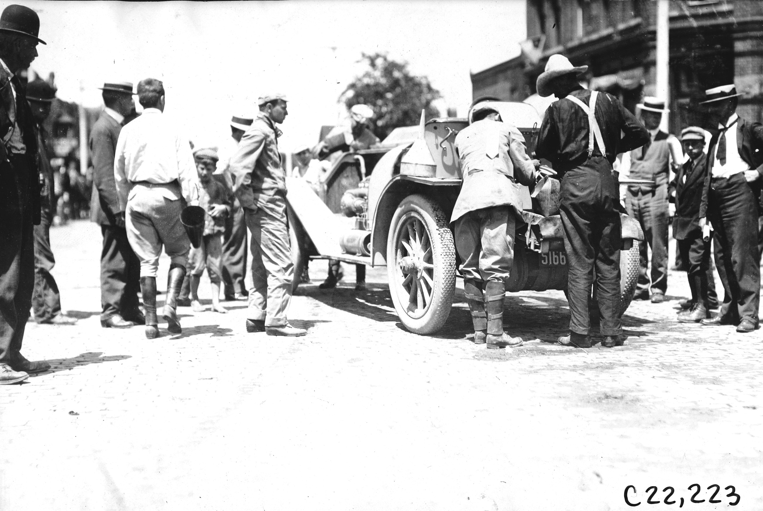 Men adding fluids to car in Elroy, Wis., 1909 Glidden Tour