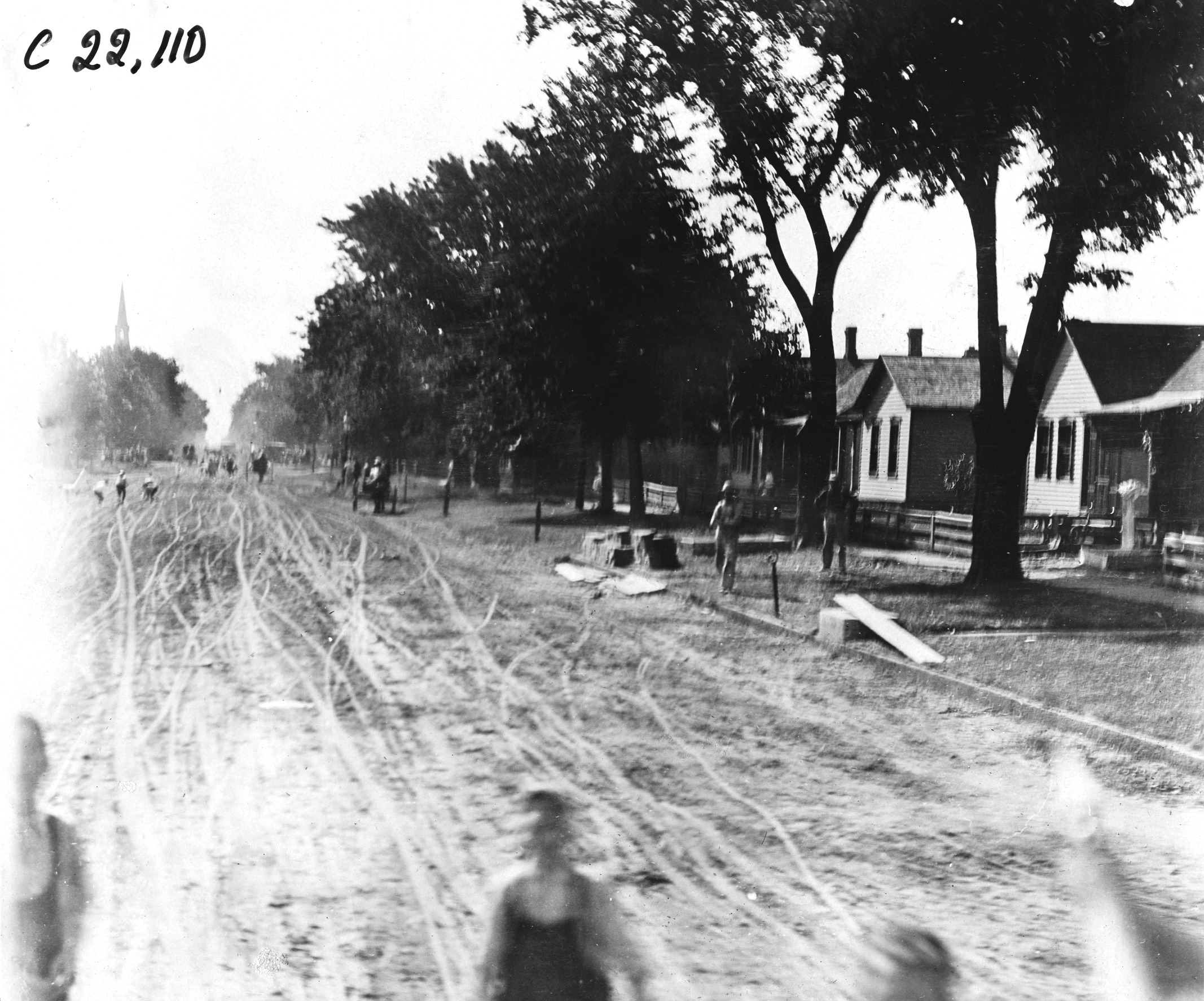4.5x5.5 black and white photograph of a rural street with houses on the right, young boys out of focus in the foreground, in Winona, Wisconsin, at the 1909 Glidden Tour. Caption on photo back: 'Winona boys picking up the advertising matter thrown out by the riders in the Thomas car.' Negative #C22,110.