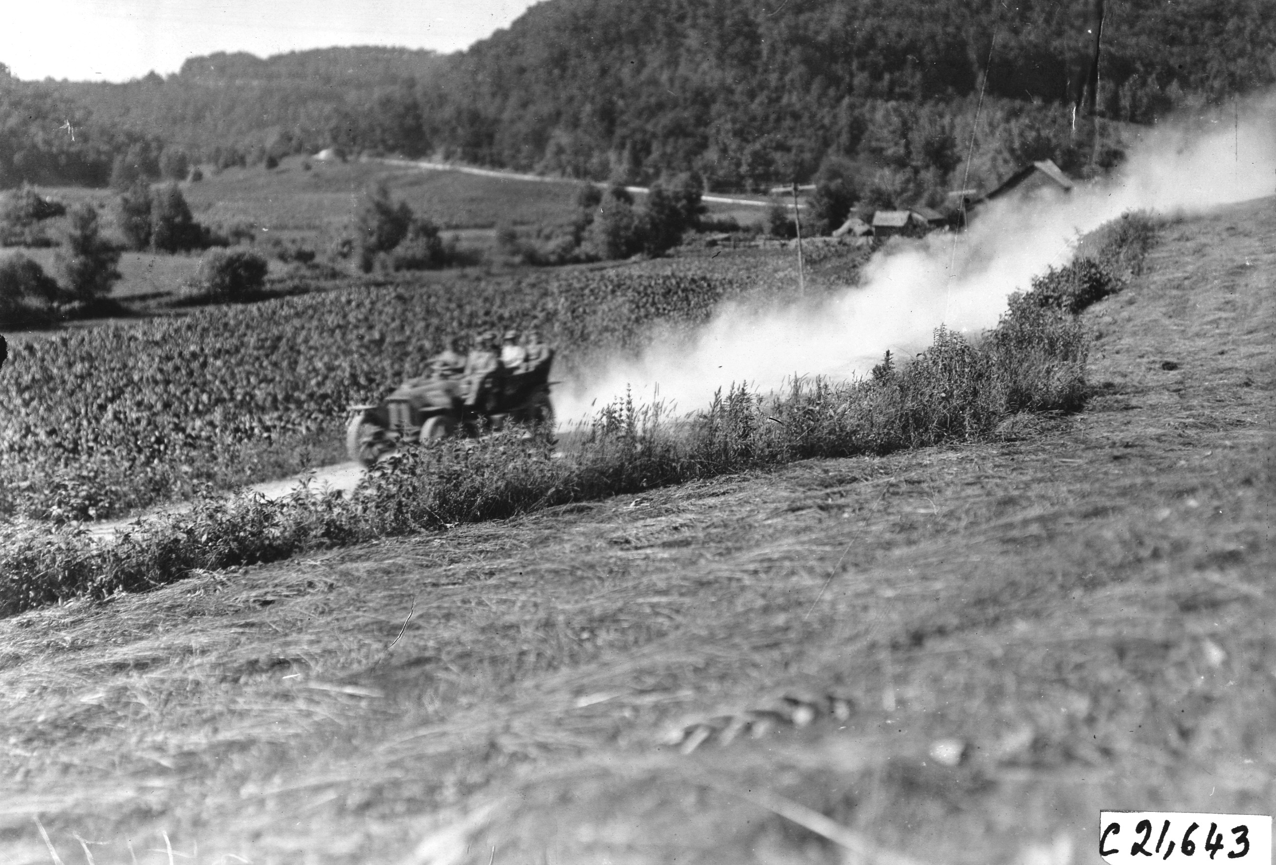 4.5x6.5 black and white photograph of Thomas Flyer car, driven by Gus G. Buse with three passengers, on a dirt road with a cloud of dust trailing behind at the 1909 Glidden Tour. Negative #C21,643.