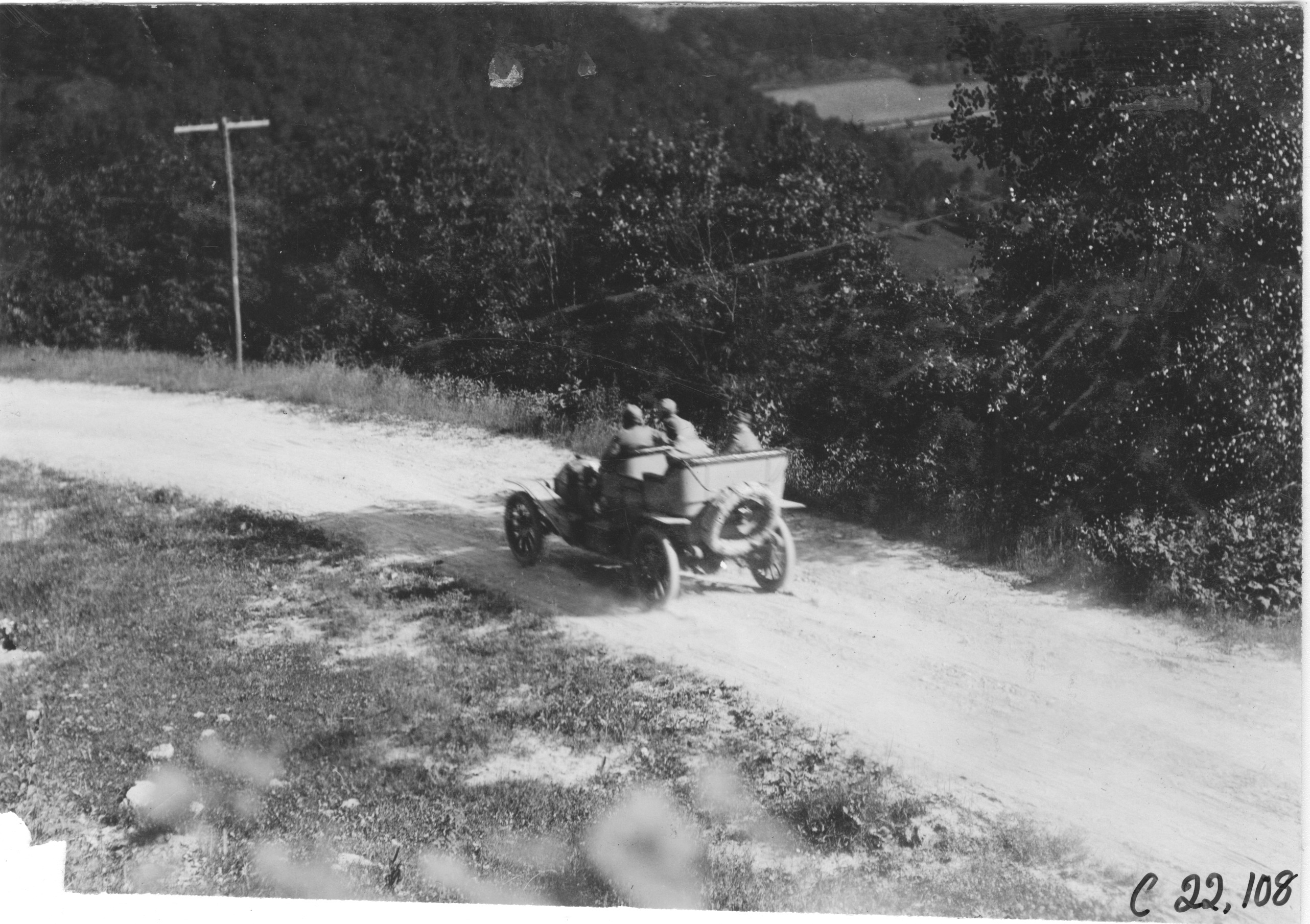 4.5x6.5 black and white photograph rear view of Glidden tourists passing through Pleasant Valley, Minnesota, with a driver and two passengers, on a dirt road at the 1909 Glidden Tour. Negative #C22,108. Photo edges cut unevenly.