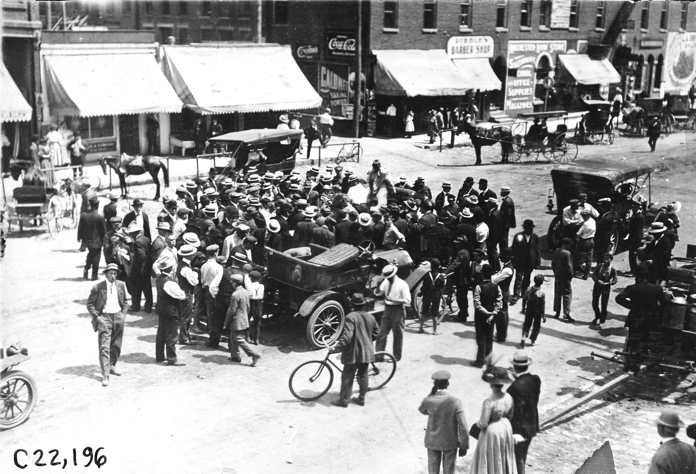 Large crowd surrounds Chalmers car in Rochester, Minn. at the 1909 Glidden Tour
