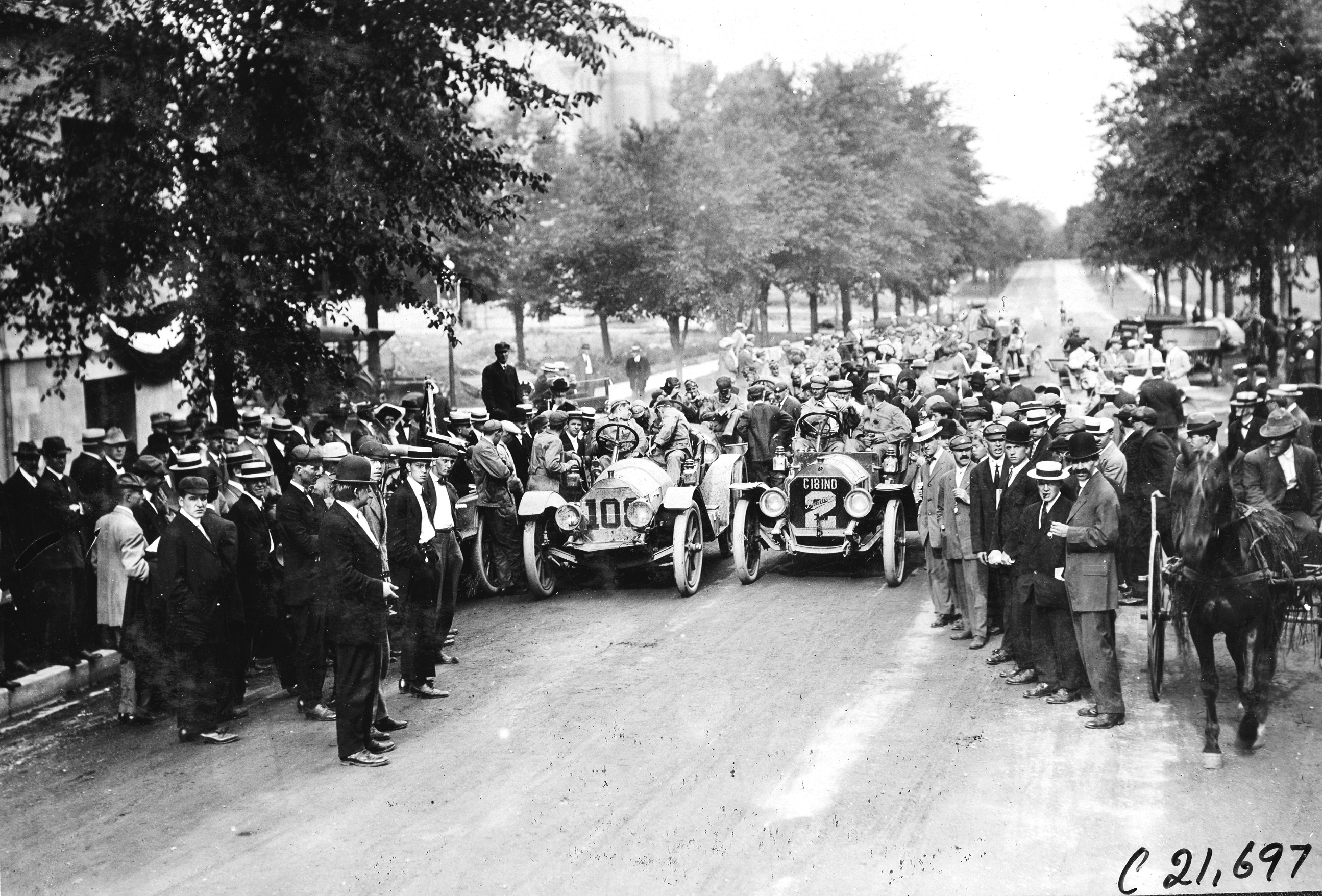 Premier and Moline cars surrounded by crowd in Rochester, Minn., at the 1909 Glidden Tour