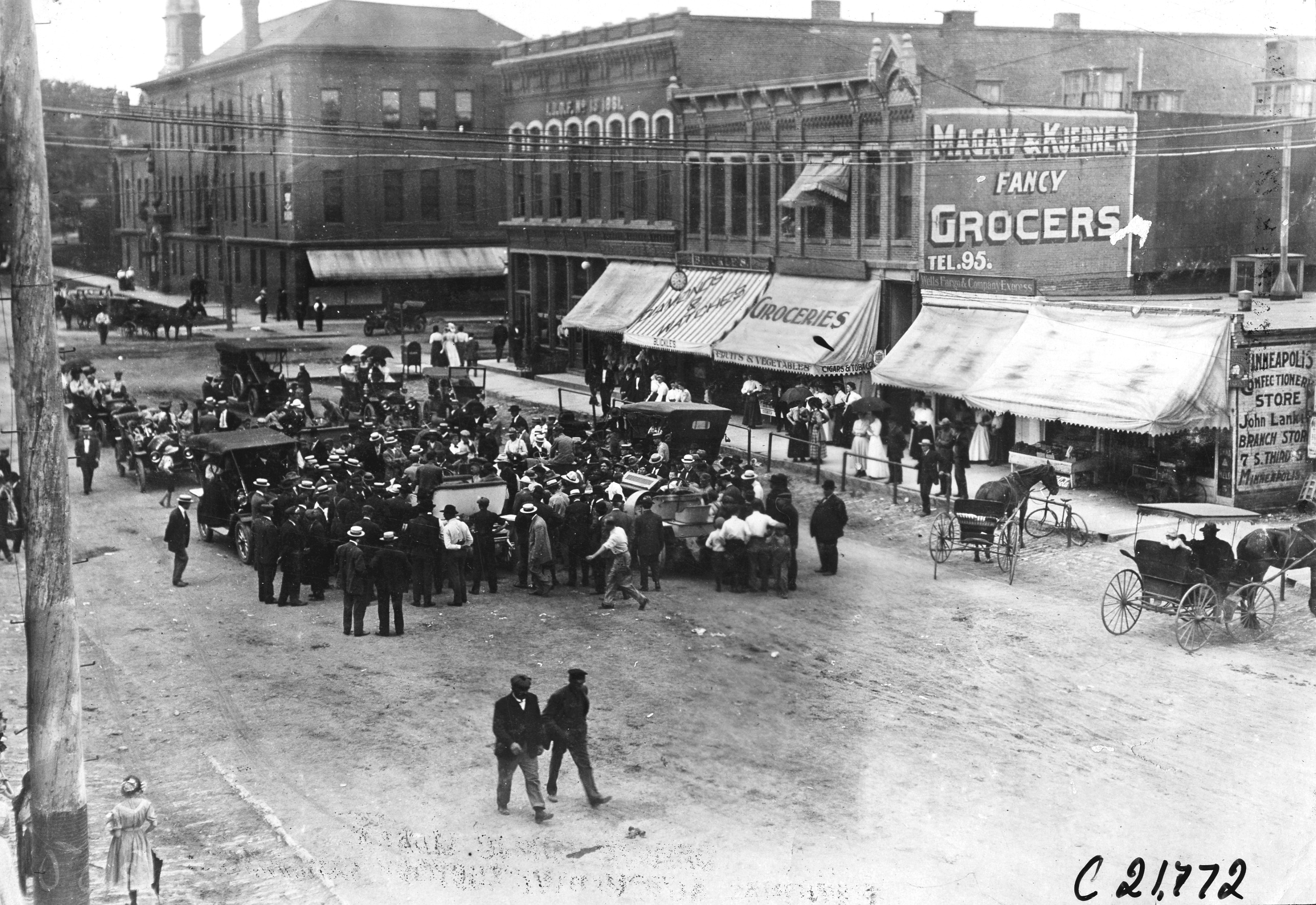 Bird's eye view of crowd greeting Glidden tourists in Rochester, Minn., at the 1909 Glidden Tour