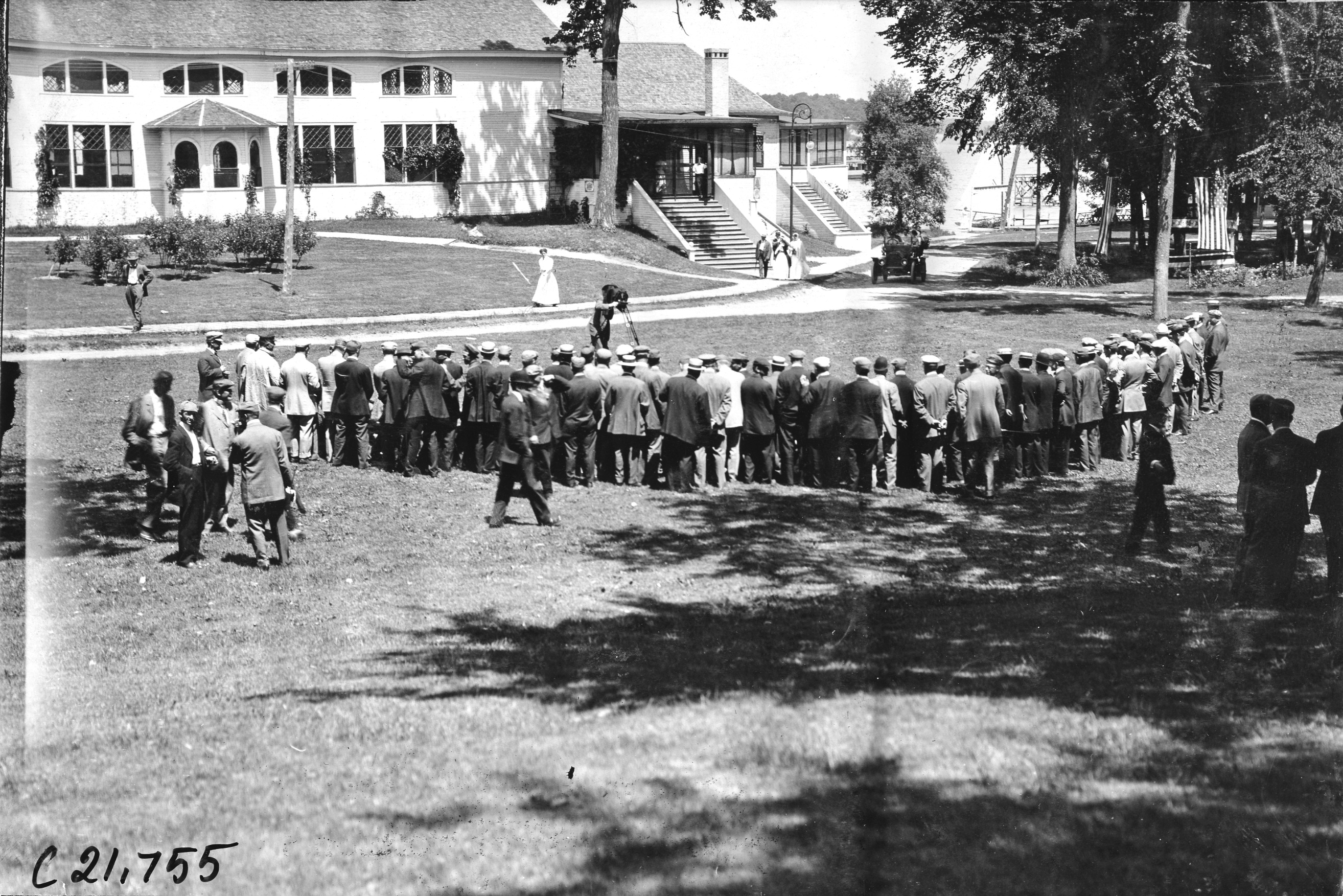 4.5x6.5 black and white photograph of Glidden tourists having their picture taken outside of the Tonka Hotel in Minnesota, at the 1909 Glidden Tour. Negative #C21,755.