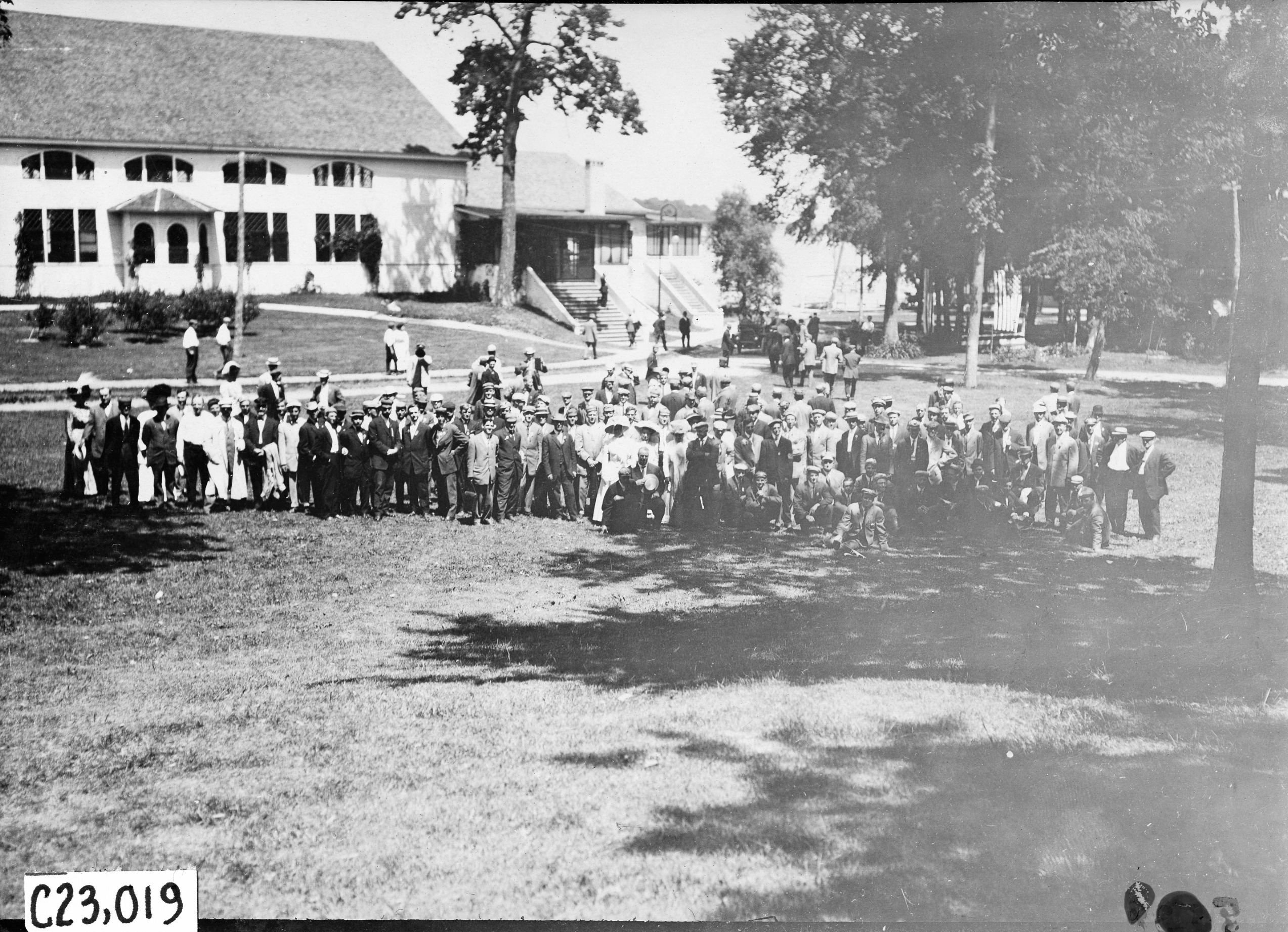 4.5x6.5 black and white photograph of tourists having their picture taken in front of the Tonka Hotel in Minnesota, at the 1909 Glidden Tour. photograph #C23,019.
