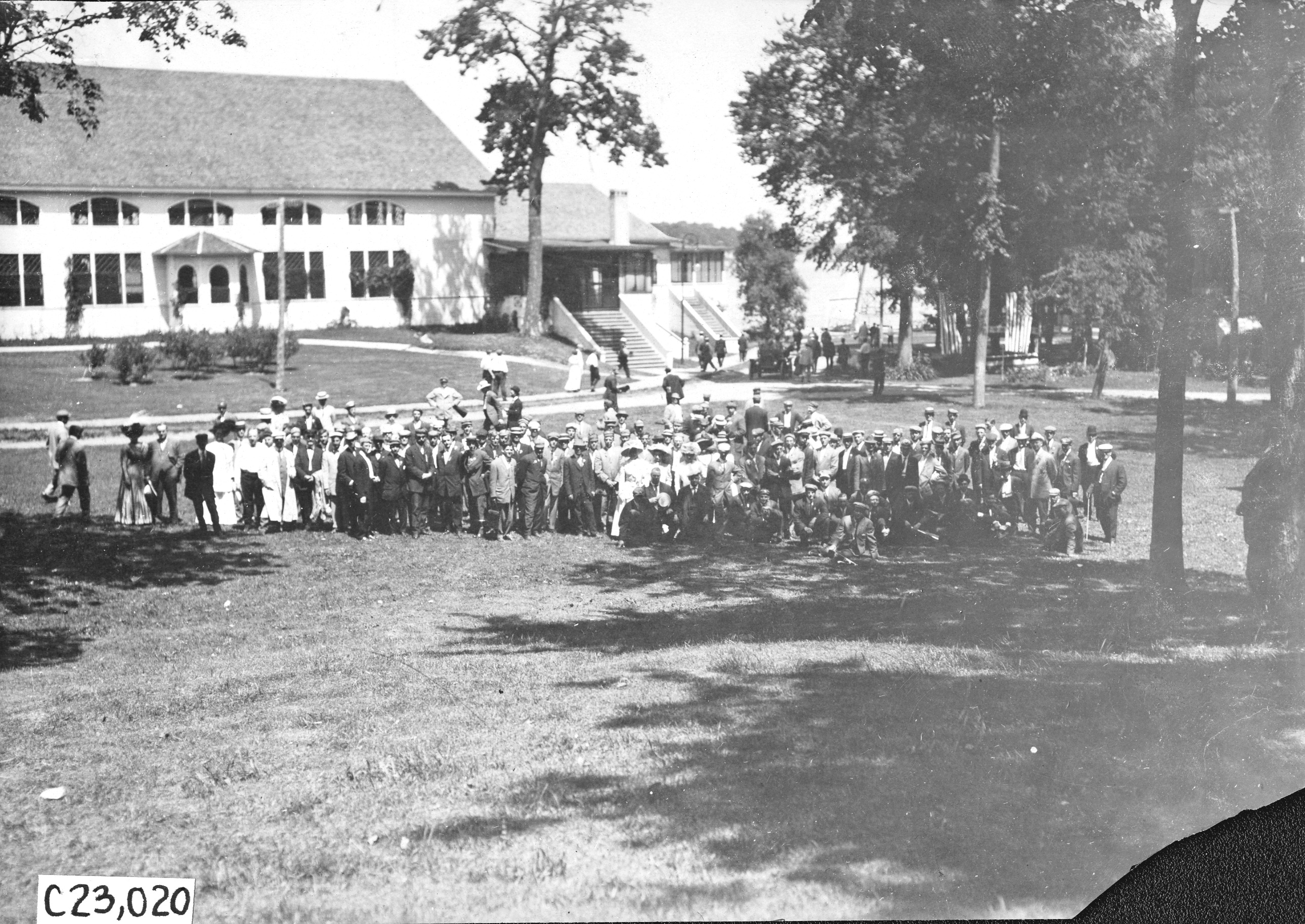 4.5x6.5 black and white photograph of tourists having their picture taken in front of the Tonka Hotel in Minnesota, at the 1909 Glidden Tour. Negative #C23,020. Lower right corner missing.