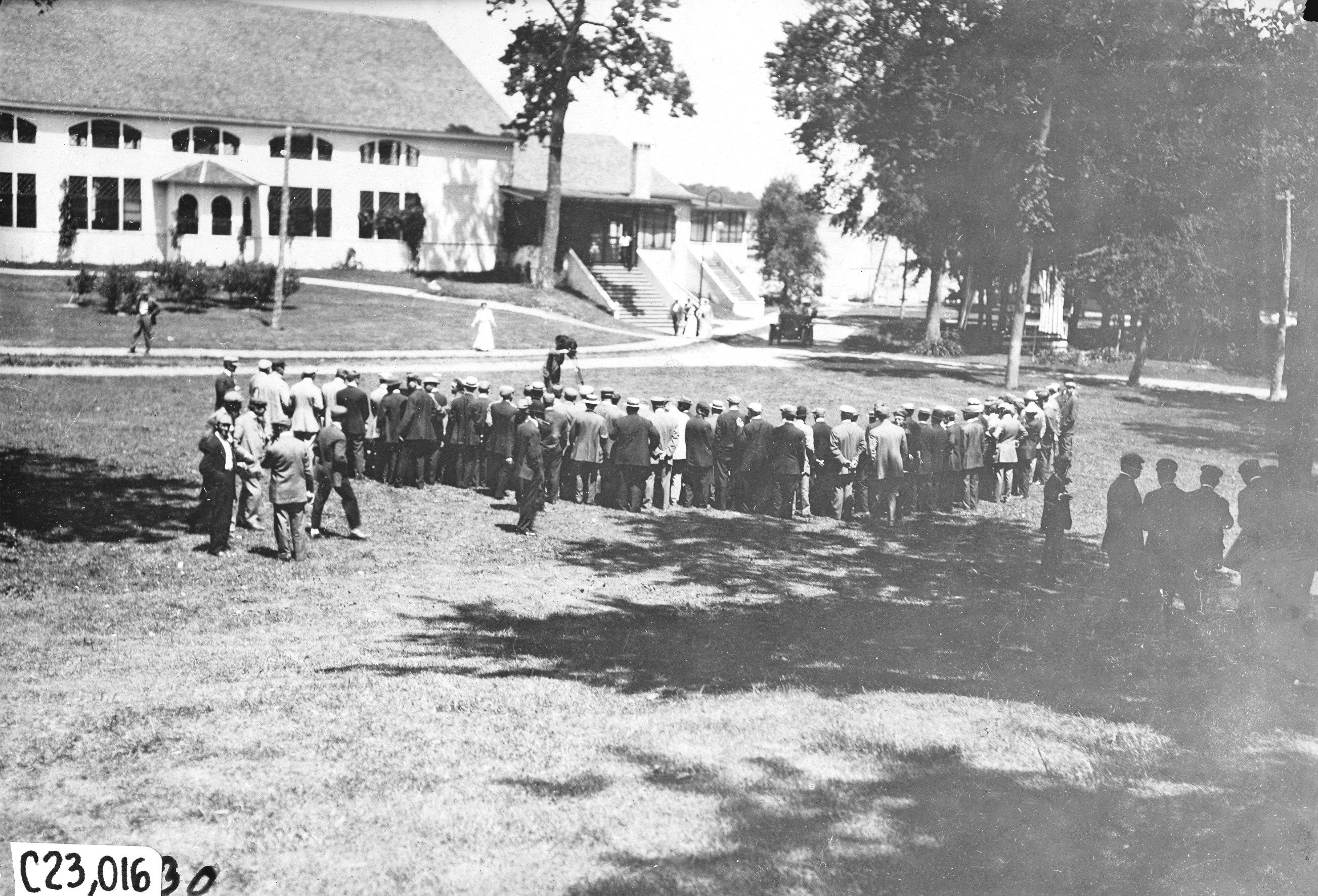 4.5x6.5 black and white photograph of tourists having their picture taken in front of the Tonka Hotel in Minnesota, at the 1909 Glidden Tour. Negative #C23,016.