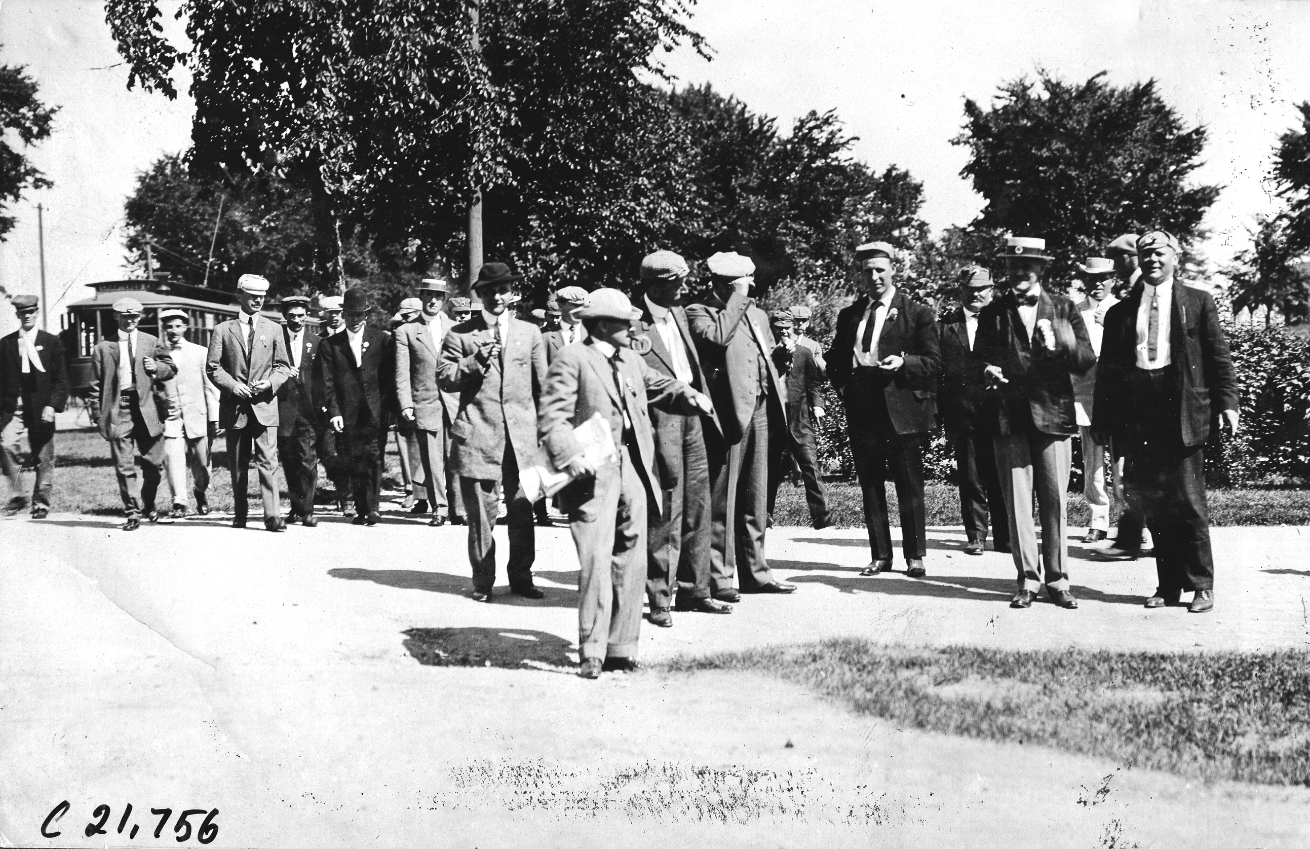4.25x6.5 black and white photograph of Glidden tourists in park-like setting, streetcar in background, in Minnesota, at the 1909 Glidden Tour. Negative #C21,756. Photo edges cut unevenly.