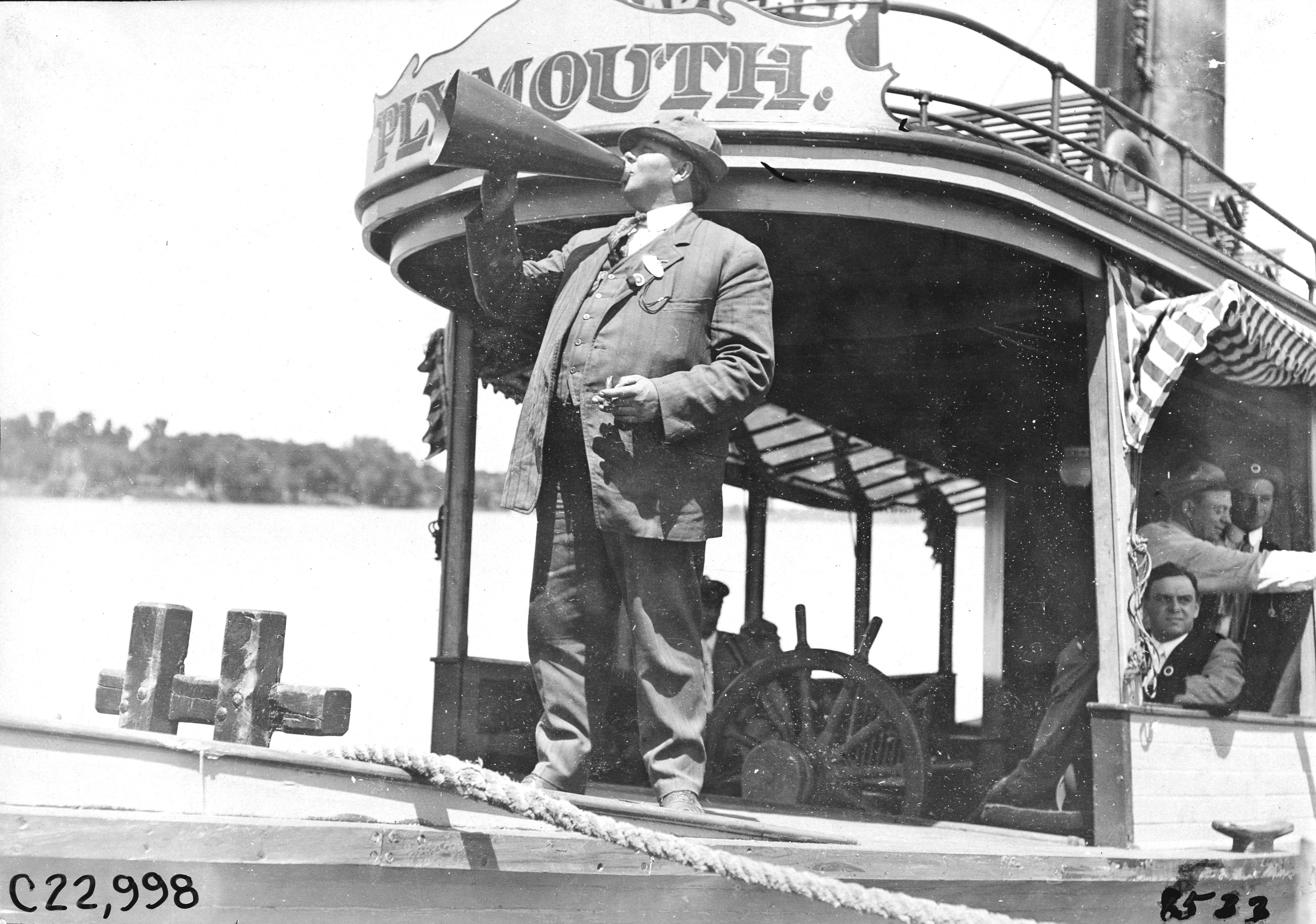 4.5x6.5 black and white photograph of Studebaker driver George Smithson on bow of 'Plymouth' excursion boat with megaphone at mouth, at the 1909 Glidden Tour. Negative #C22,998. Photo edges cut unevenly.