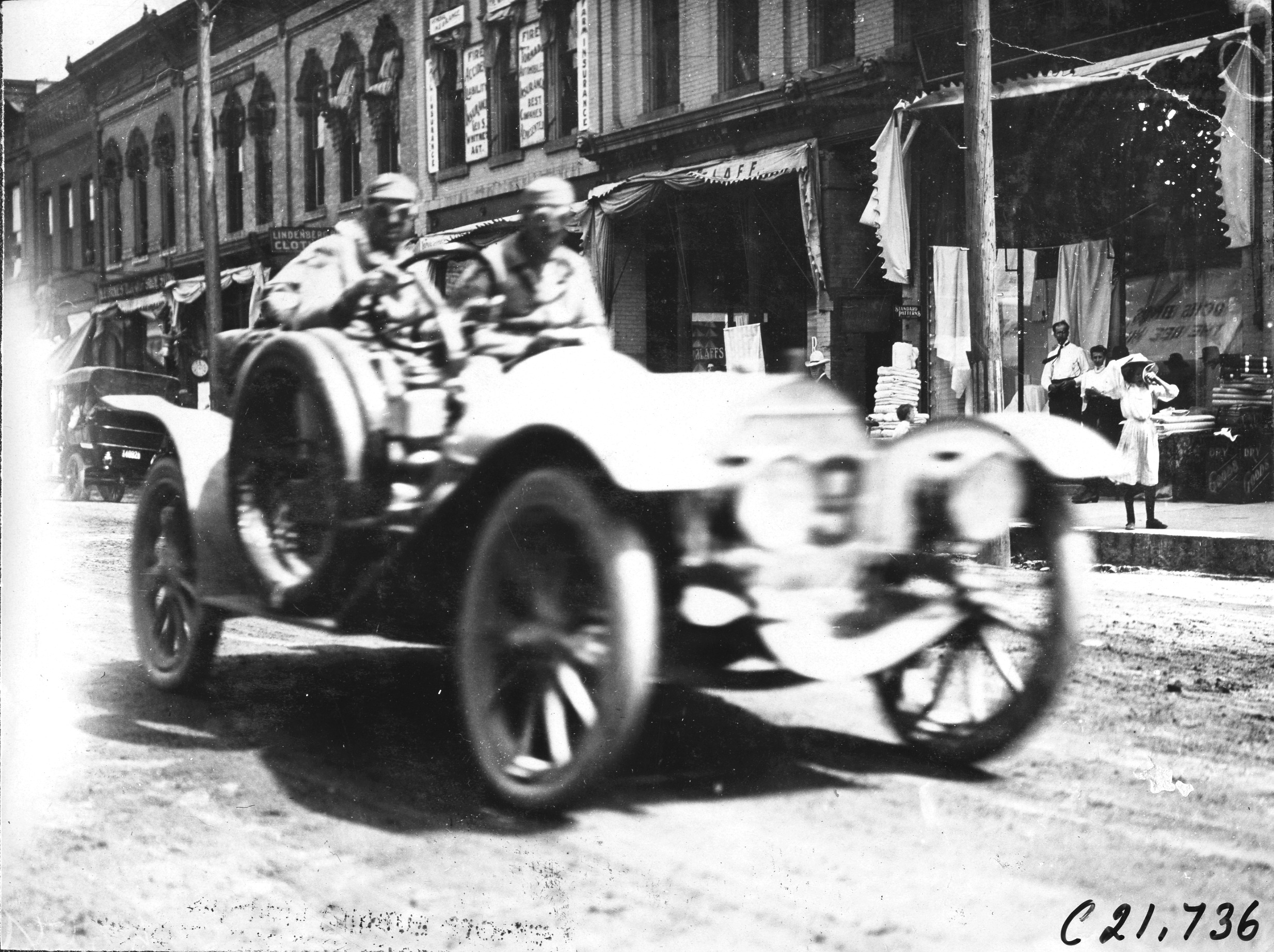 Charles Schofield in Pierce-Arrow car passing through Faribault, Minn., at 1909 Glidden Tour