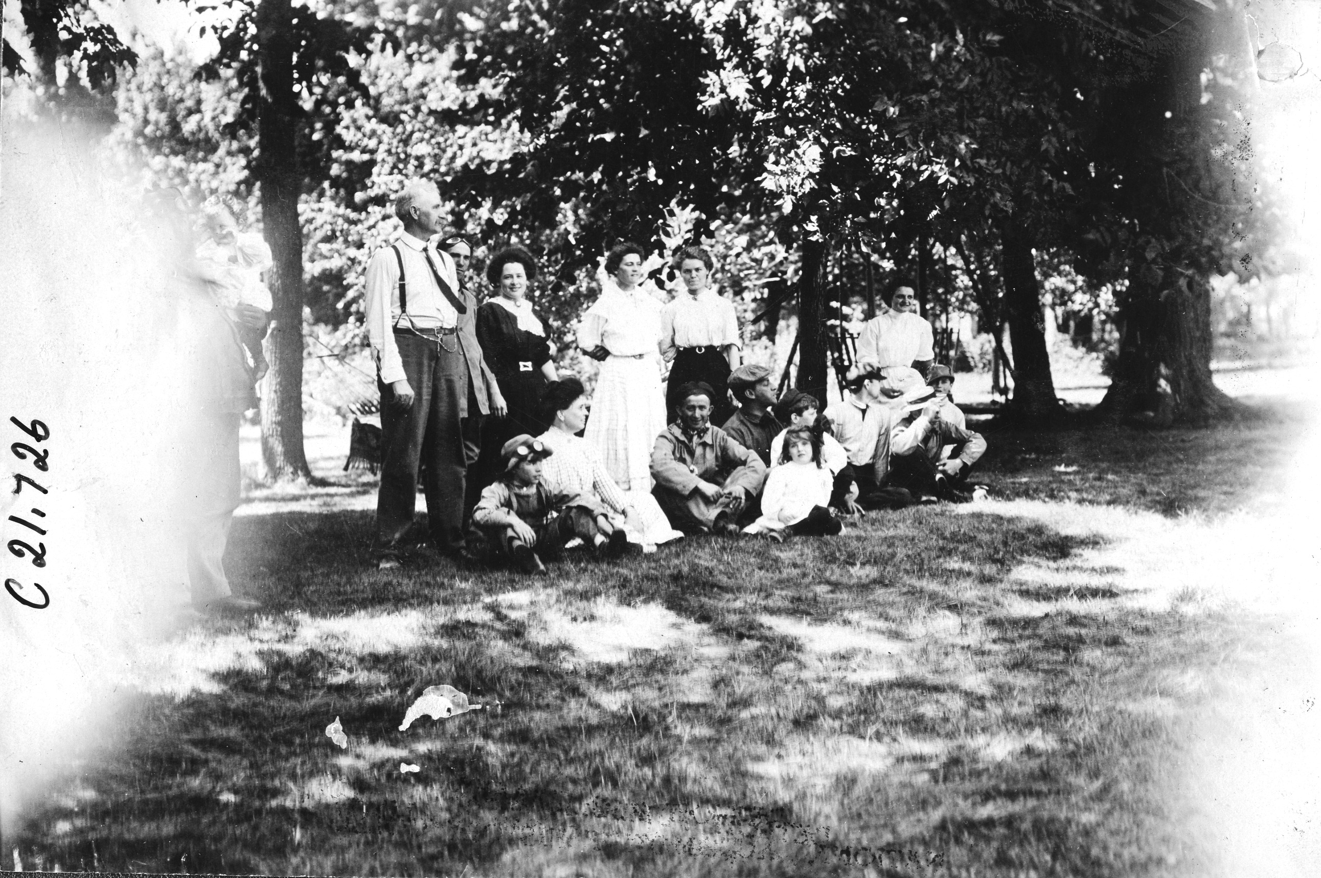 4.5x6.5 black and white photograph of Glidden tourists posing with Judge McDermott in park at Madison Lake, Minnesota, at the 1909 Glidden Tour. Negative #C21,726. Photo edges cut unevenly.